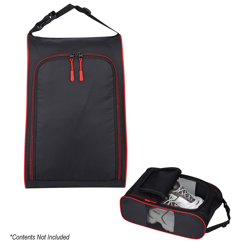 Hit Black/Red Crosstown Side-Mesh Shoe Bag with your corporate logo is the safe, clean, and easy way to keep your shoes at hand and away from clean clothes. Whether traveling across the world or across town, this zip-open bag with mesh side panels will keep your shoes separate from other items. Choose from several zipper liner and pull color options.