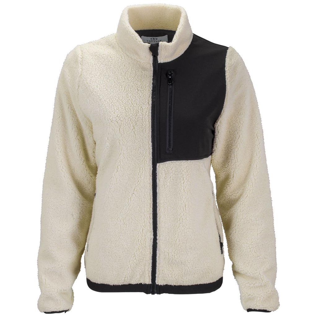 A company logo will stand out on the Vantage Women's Natural/Black Denali Jacket with solid base color and a patch over the area that a logo will most likely be displayed. This play on color creates the perfect canvas for your custom logo to be shared. The ultra-cozy, chunky Sherpa jacket has texture and warmth with a polyester fleece lining and inner storm flap with chin guard for added warmth. A left chest zipper pocket and hand pockets keep small items in place as you go about your day.Corresponding Men's Style: Vantage Men's Natural/Black Denali Jacket