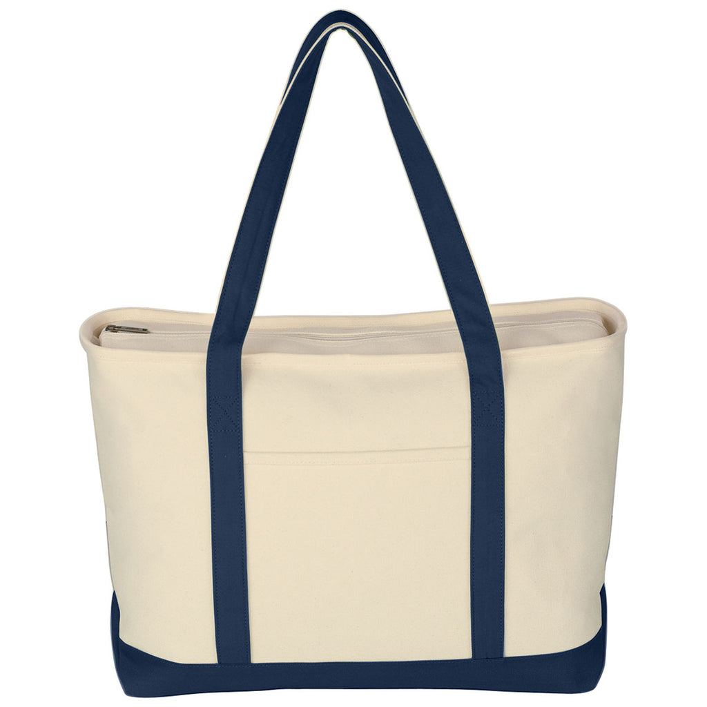 Enjoy the Hit Natural/Navy Large Starboard Cotton Canvas Tote Bag with a custom logo. This neutral color bag has a bottom panel and shoulder straps in several color options to fit your needs. The ideal option for the beach, park, or road trip, the roomy tote zips closed for convenience. Give as a gift or add to your logoed items for sale.