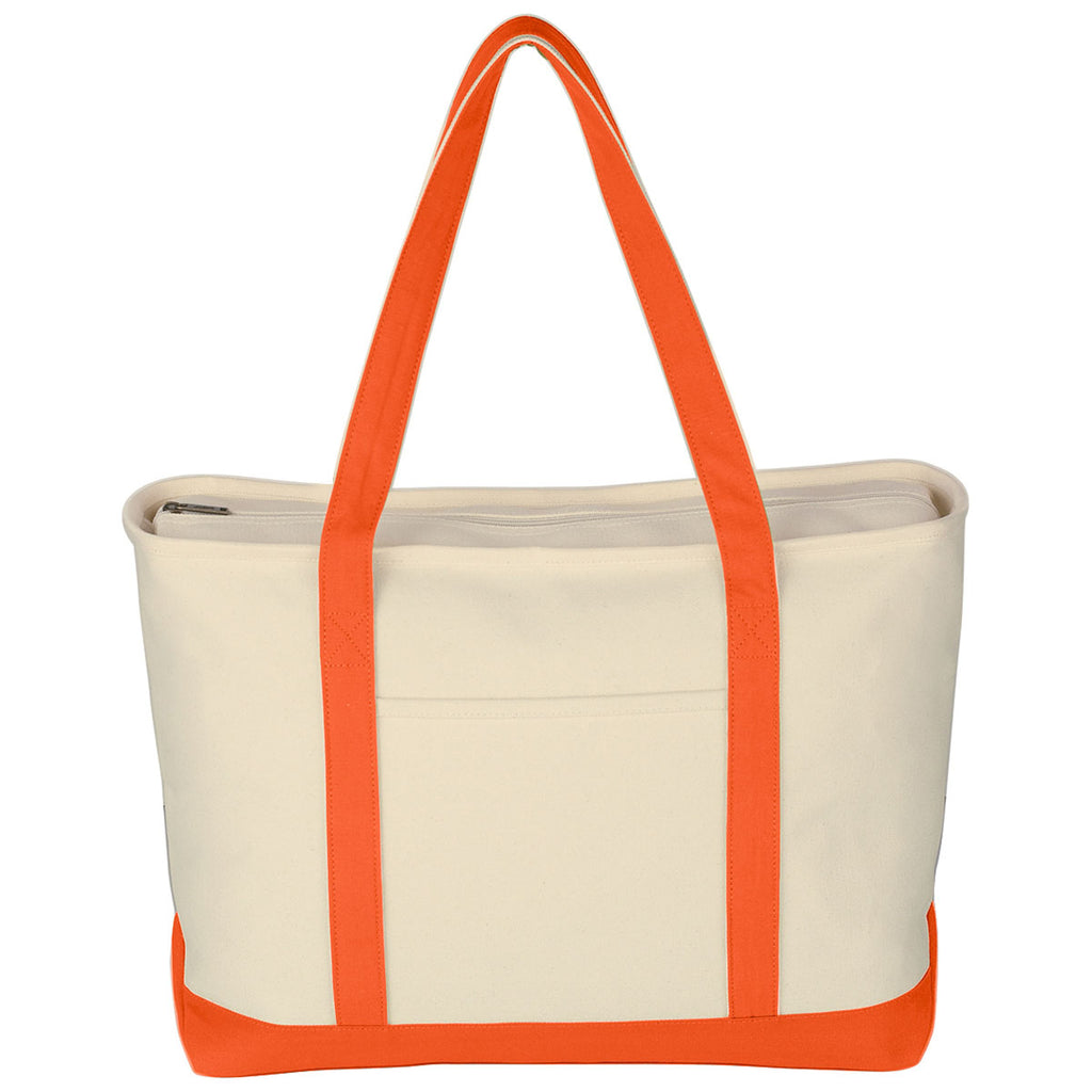 Enjoy the Hit Natural/Orange Large Starboard Cotton Canvas Tote Bag with a custom logo. This neutral color bag has a bottom panel and shoulder straps in several color options to fit your needs. The ideal option for the beach, park, or road trip, the roomy tote zips closed for convenience. Give as a gift or add to your logoed items for sale.