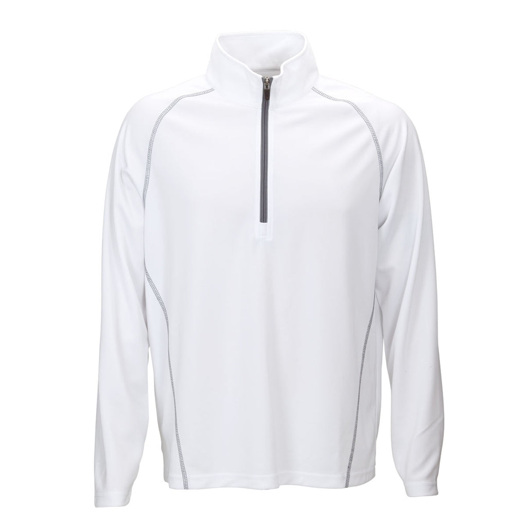 Vantage gives new meaning to the term high performance by introducing the company logoed Vantage Men's White Performance Pullover. Designed with twill knit, the pullover contains highly durable polyester that enables the fabric to remain in pristine condition for years to come. The quarter-zip neck and contrast zipper complement triple-needle stitching to produce a chic corporate gift for your loyal customers. Wear the high performance pullover as an outer layer and as the middle layer between a Vantage tee and winter jacket. Add a custom logo on the large imprint area to wow customer prospects at business conferences.Corresponding Women's Style: Vantage Women's White Performance Pullover