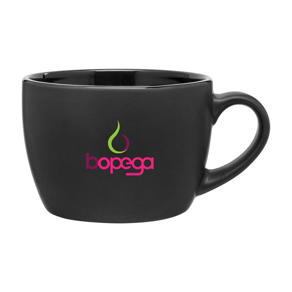 An ETS Black/Black Bolzano Ceramic Mug 18 oz with contrasting hues meaning it has a matte black exterior finish and a colored interior. It is a perfect promotional mug for an imprint of a bright, striking logo or brand message as it will stand out against the dark backdrop.