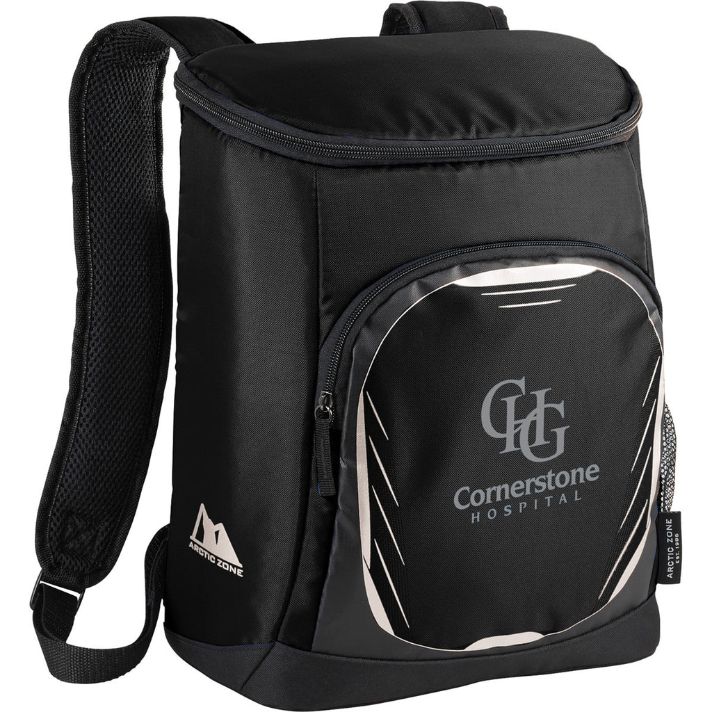 Do your backpack cooler shoulder straps dig into your back and shoulders? Eliminate the discomfort of carrying heavy loads by ordering the custom logo-branded Arctic Zone Black 18 Can Cooler Backpack. Rugged 420d polyester protects your cold beverages from strong impacts that can cause punctures. The large primary compartment holds up to 24 cans of your favorite drink. Easy to clean PEVA lining prevents leaks from the cooler backpack. Use the exterior zippered pocket to store accessories, such as a smartphone and car keys. Add your company logo to create recognition for your brand everywhere you go.