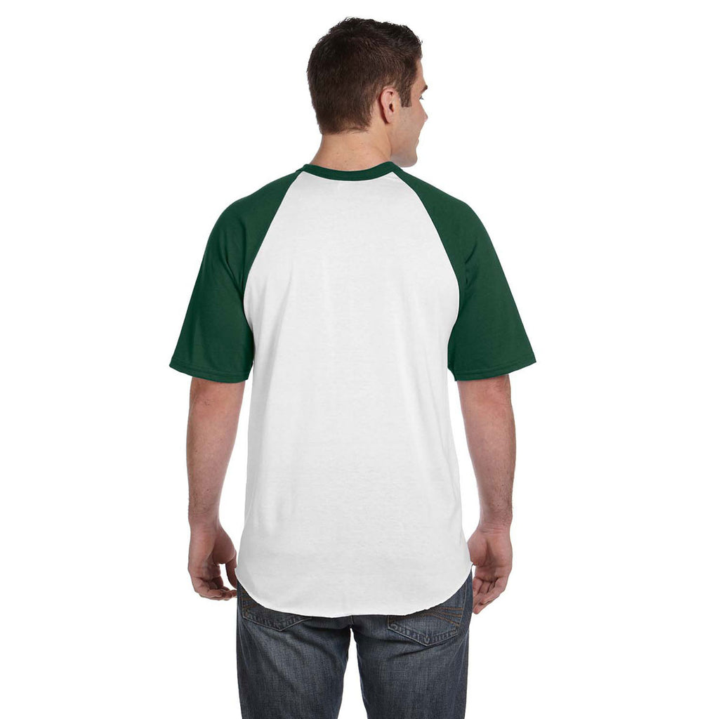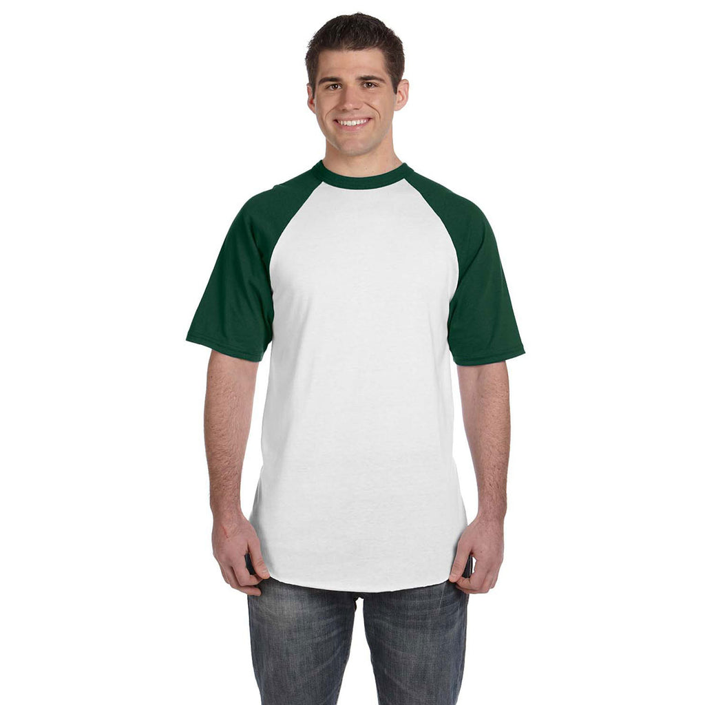 Attach your company logo to Augusta Sportswear Men's White/Dark Green Short-Sleeve Baseball Jersey for a stylish shirt, perfect for a day at the park or as employee apparel for the company softball team. Available in 16 different colors, choose the right color tone to match your company logo. Features of this must-have clothing item include a comfortable 50/50 cotton/polyester jersey knit fabric, contrasting color sleeves, double-needle hem sleeves, and fishtail bottom. Purchase this shirt as corporate apparel and add your screen print company logo to the front of the shirt for the perfect finishing touch.Highlights