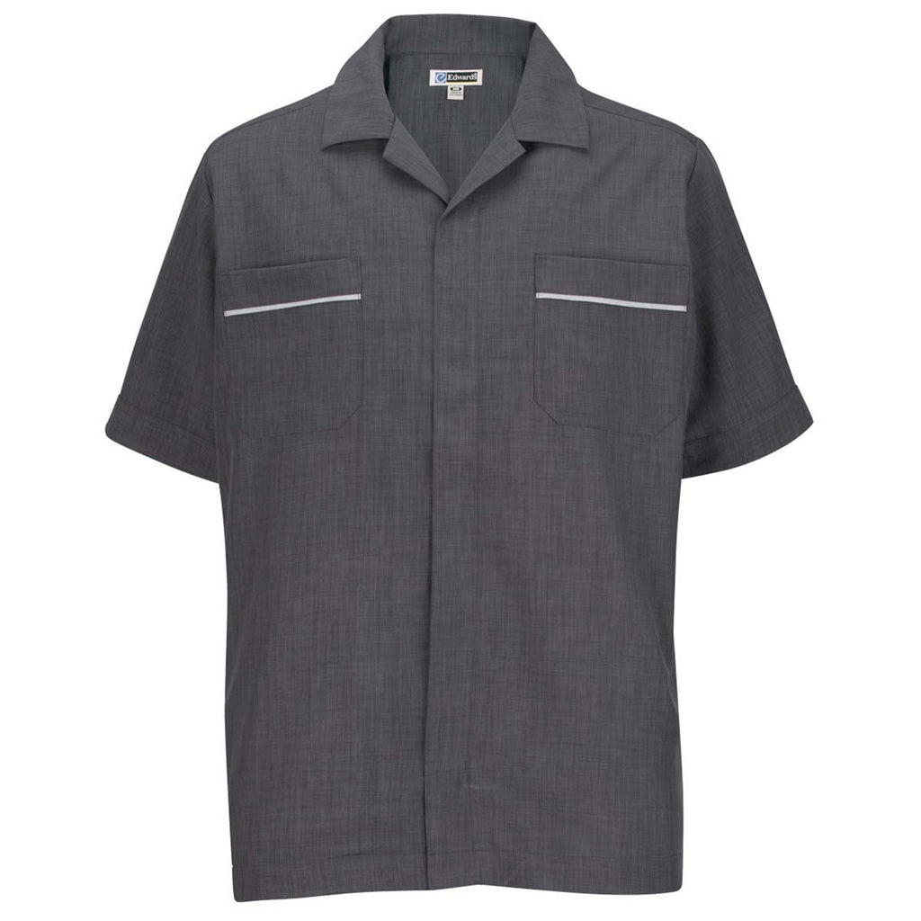Add a custom embroidery to the Edwards Men's Steel Grey Pinnacle Service Shirt to create a look unique to your company or organization. Made of 100% polyester the contemporary styling of this comfortable to wear, easily washable shirt is unmatched. Available in six color combinations this service shirt is ideal as part of employee apparel when paired with slacks or as corporate uniforms for large organizations. The hidden placket with zipper down front with snap closure ensures a tidy appearance on the short sleeve shirt with contrasting piping on the pockets.Highlights