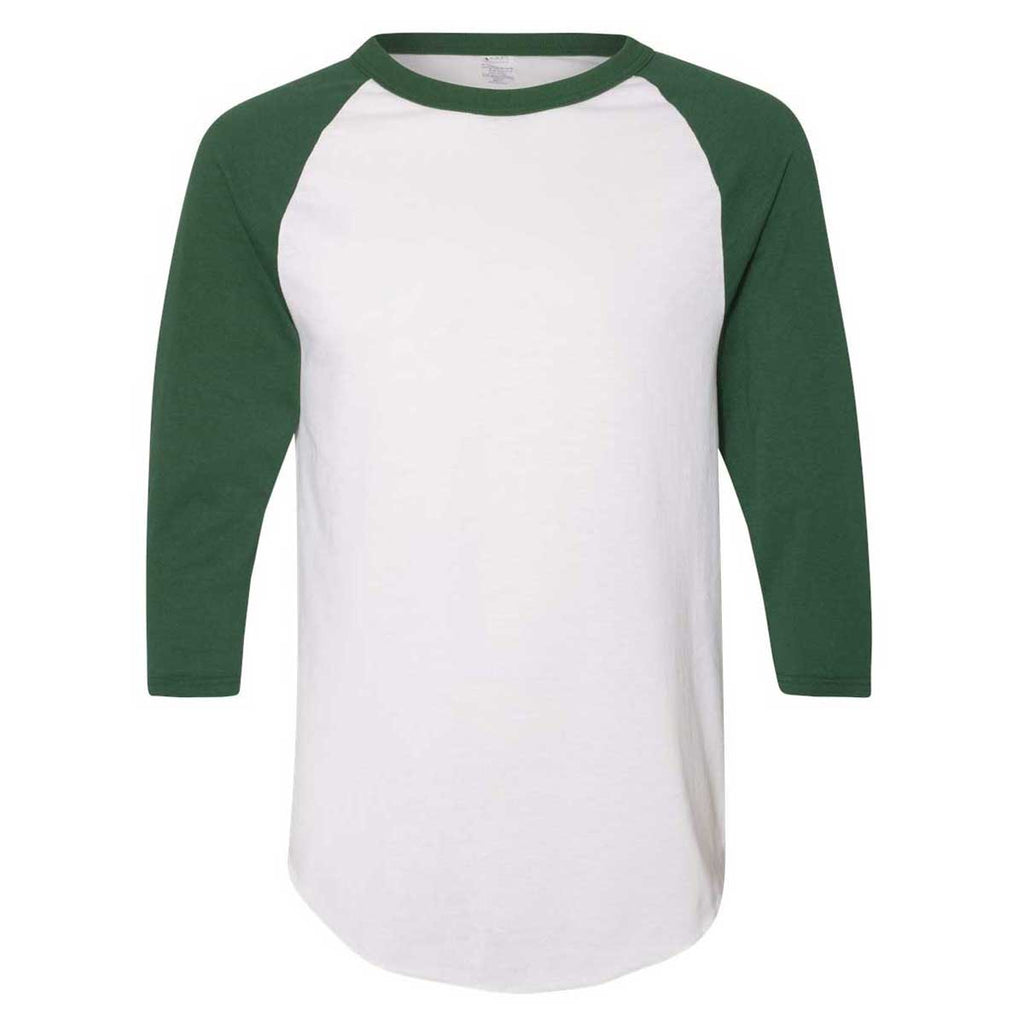 Custom uniforms have never been easier to create than with the Augusta Sportswear Men's White/Dark Green Three-Quarter Raglan Sleeve Baseball Jersey. This classically designed raglan made of a polyester, cotton blend offers contrasting color rib collar and raglan sleeves for a creative look that will be an instant hit. Add a screen print of your company logo for company-wide events like softball or family games. The double needle hemmed sleeves add extra durability and the surged fishtail bottom provides extra coverage as you slide into home. For a fun twist, add a logo you design to give as gifts or to use as employee apparel where appropriate. Comfort, convenience, and style come together to create this jersey.Highlights