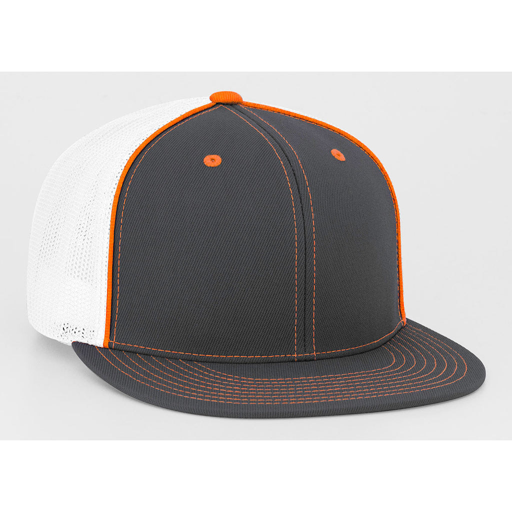 The flat bill of the logoed Pacific Headwear Graphite/White/Neon Orange D-Series Fitted Trucker Mesh Cap remains firm for years to come. As one of the new cap styles, the flat bill makes a bold fashion statement and it protects your eyes from the sun. The major league structured profile will have your professional peers envious at the next corporate softball game. By adding a custom logo, you create interest in your company at outdoor civic events. M3 performance fabric front panels resist rips and tears, as well as endure frequent use. Enjoy air circulation produced by the design of the stretchable spandex Trucker mesh back.Highlights