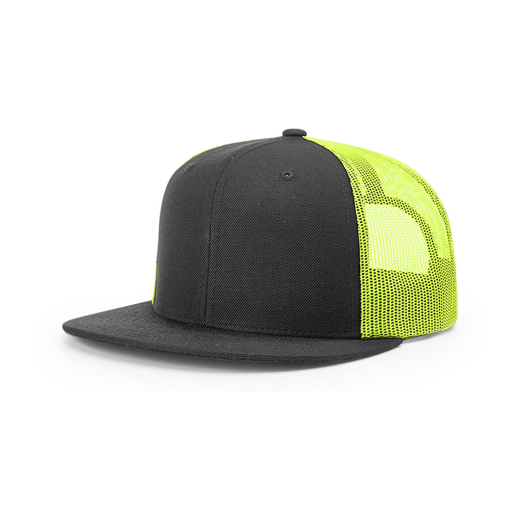 Join forces with the custom logoed Richardson Black/Neon Yellow Mesh Back Wool Blend Flatbill Trucker Hat to reach a target audience and increase brand awareness at sporting events and outdoor promotions. It features a wool blend front and mesh back. Custom trucker hats with a logo or team name are a great way to heighten team spirit or corporate swag and bring attention to your brand.The minimum order for this product is 48 pieces.