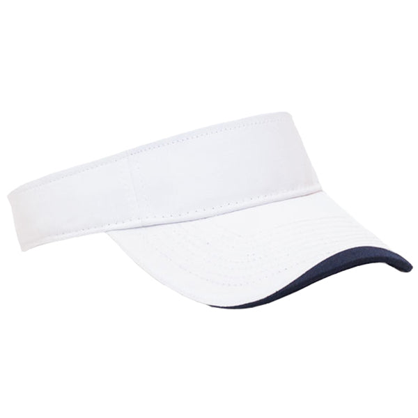 Keep the sun out of your eyes in a custom embroidery Pacific Headwear White/Navy Polo Twill Hook-And-Loop Visor in four color combinations. The front panel in cotton fabric makes the ideal canvas for your corporate embroidery or company logo in nearly every color. A pro-stitched finish and contrast binding under visor means this visor will stand the test of time even if you wear it daily. Use this as an accessory on the next corporate retreat or to wear to your favorite sporting events. Add a custom logo and use as part of employee apparel to complete a uniform that is completely unique. Choose the design that best represents your company and place an order today.Highlights