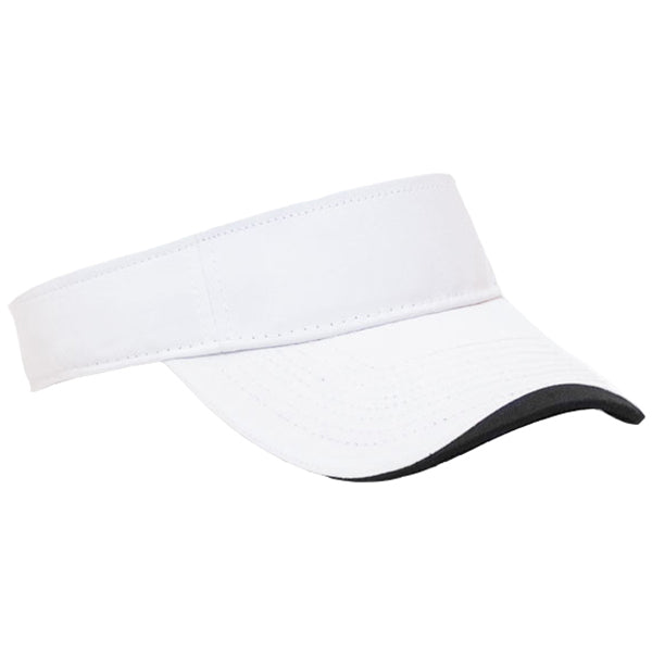 Keep the sun out of your eyes in a custom embroidery Pacific Headwear White/Black Polo Twill Hook-And-Loop Visor in four color combinations. The front panel in cotton fabric makes the ideal canvas for your corporate embroidery or company logo in nearly every color. A pro-stitched finish and contrast binding under visor means this visor will stand the test of time even if you wear it daily. Use this as an accessory on the next corporate retreat or to wear to your favorite sporting events. Add a custom logo and use as part of employee apparel to complete a uniform that is completely unique. Choose the design that best represents your company and place an order today.Highlights