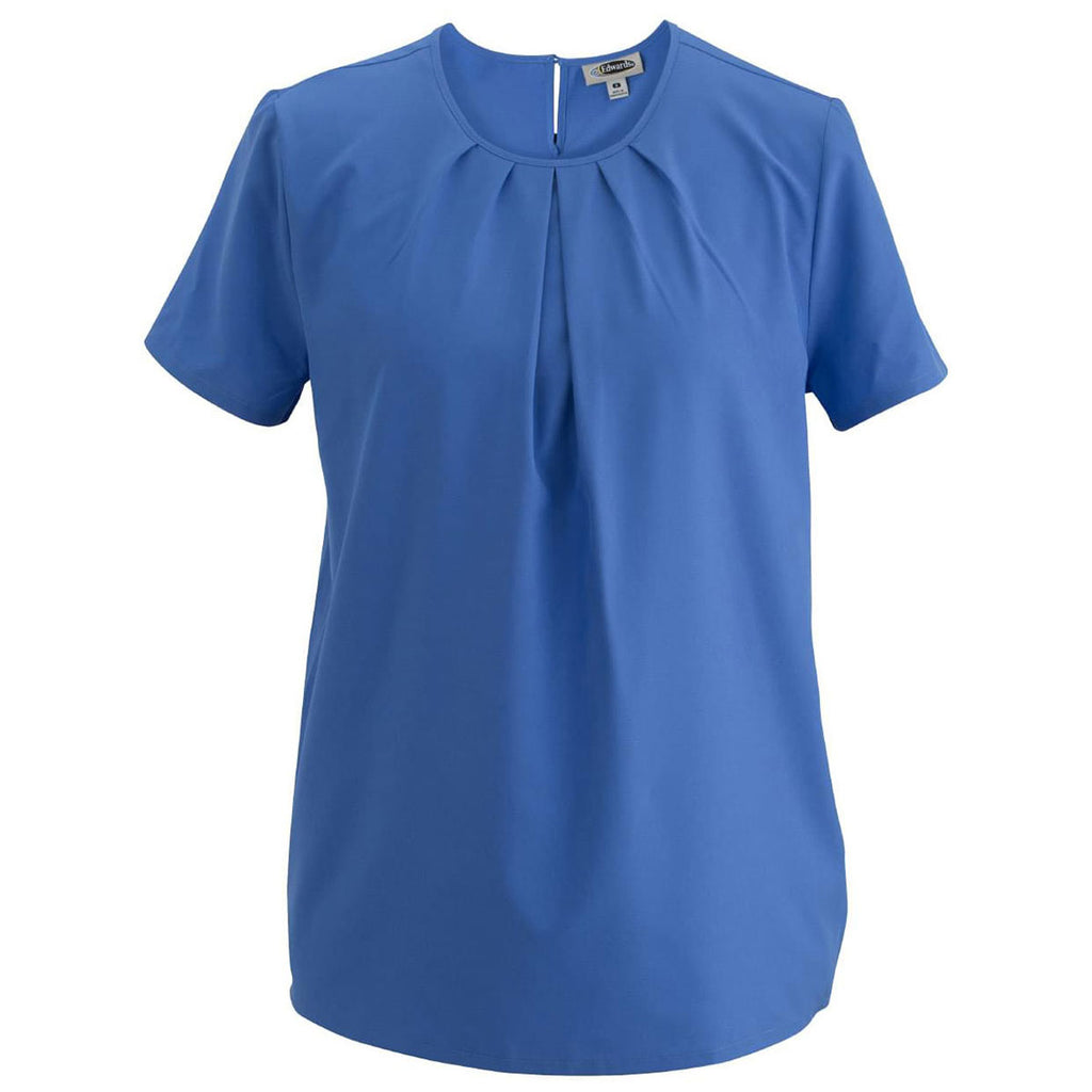 Design a special embroidery for the Edwards Women's French Blue Jewel Neck Blouse for a high-end look that can serve as corporate apparel or a custom gift as needed. Add a company logo to the polyester spandex blend in a lightweight feel with traditional fit. The short sleeve blouse is fashionable without being revealing with a jewel neckline, inverted pleats, and a slightly curved hem. Add a custom logo to include this in a special logoed apparel line that can go from the office to dinner out at top restaurants. The easy-care blouse is wrinkle resistant so wash and wear takes on new meaning.Highlights