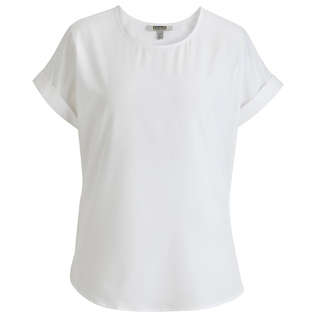 Add an embroidered custom logo to the Edwards Women's White Dolman Blouse for a clean cut look that can serve multiple functions. The polyester rich spandex blend is ideal for uniforms with rolled-up sleeves and a pullover style that can be home laundered and is wrinkle resistant. Add a corporate logo for employee wear that can be used in multiple locations. Place an order today.