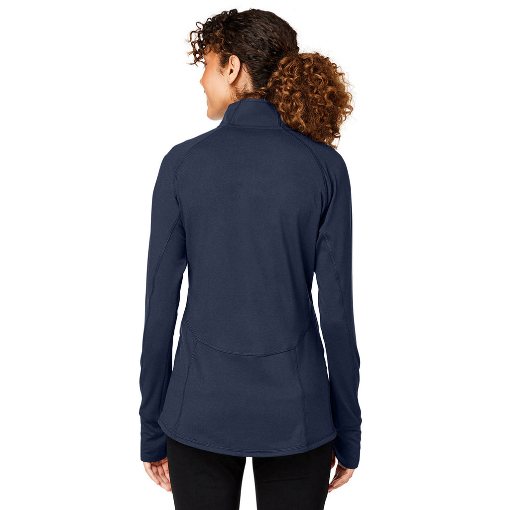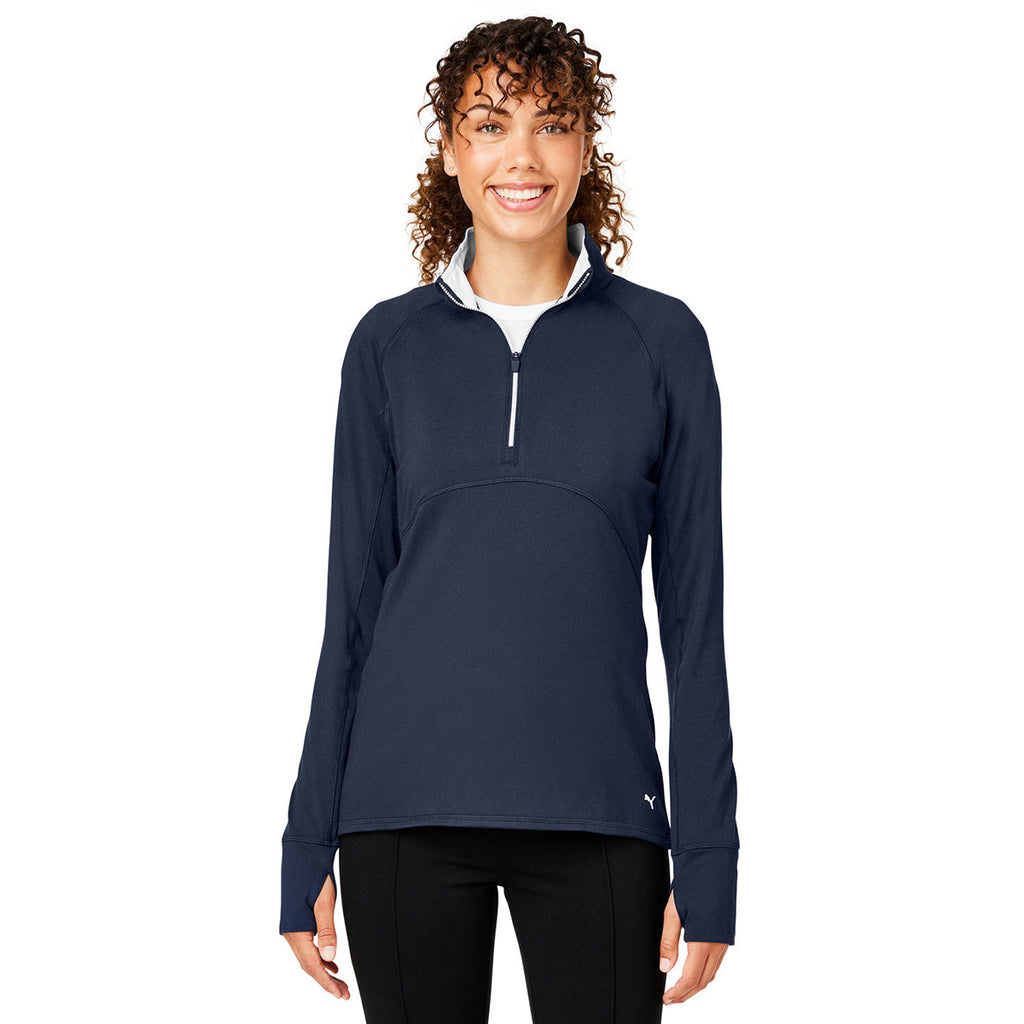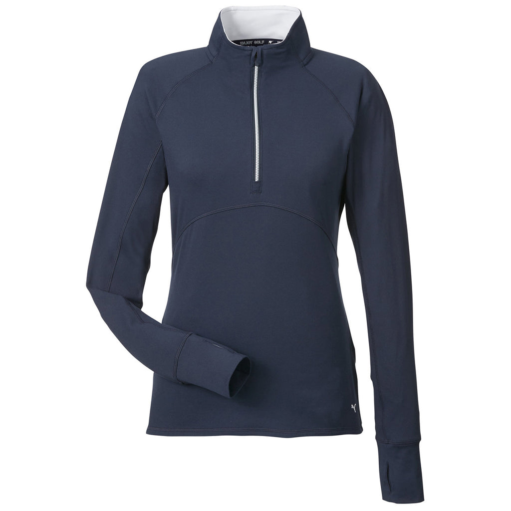 Embroidery will create a custom look with the Puma Golf Women's Navy Blazer Gamer Golf 1/4 Zip. The polyester and elastane fabric offers moisture wicking and UV resistance of 50+ for total comfort as you go about your day. Enjoy a fall day of teeing off or sip drinks with friends at the clubhouse while looking your best. Add a corporate logo to use as a uniform or gift for employees. Order today.