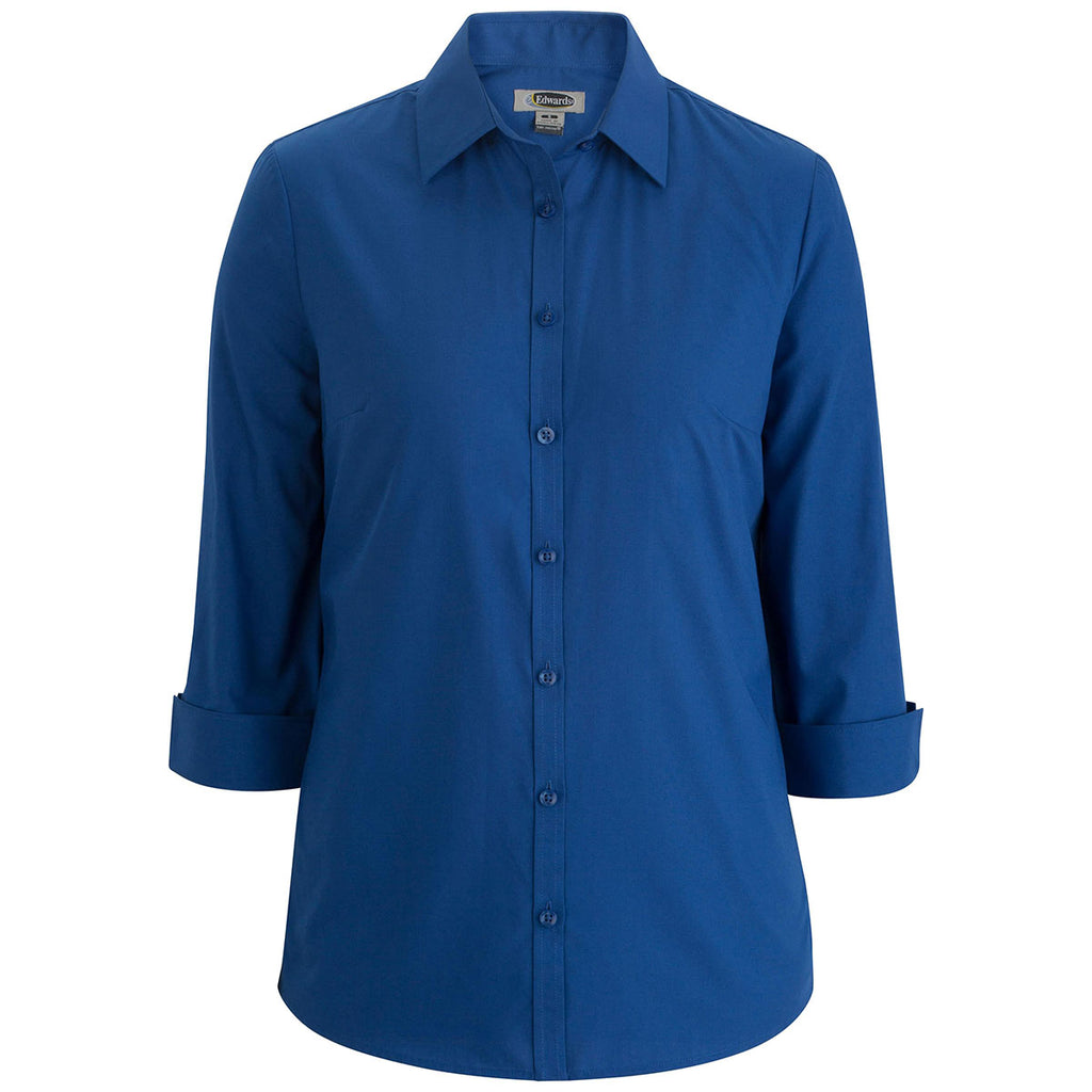 Up your uniform game with the embroidered Edwards Women's Royal Essential Broadcloth Blouse. This lightweight polyester rich cotton blend has an improved fit that makes it ideal as employee apparel with a company logo. The performance broadcloth shirt is made for comfort with a point collar with permanent stays, 3/4 sleeve with adjustable cuff, and straight back yoke seam. Wrinkle resistant, this button up will keep you looking and feeling great whether serving customers or leading a meeting. Wear alone or pair with a jacket to create a custom look.Highlights