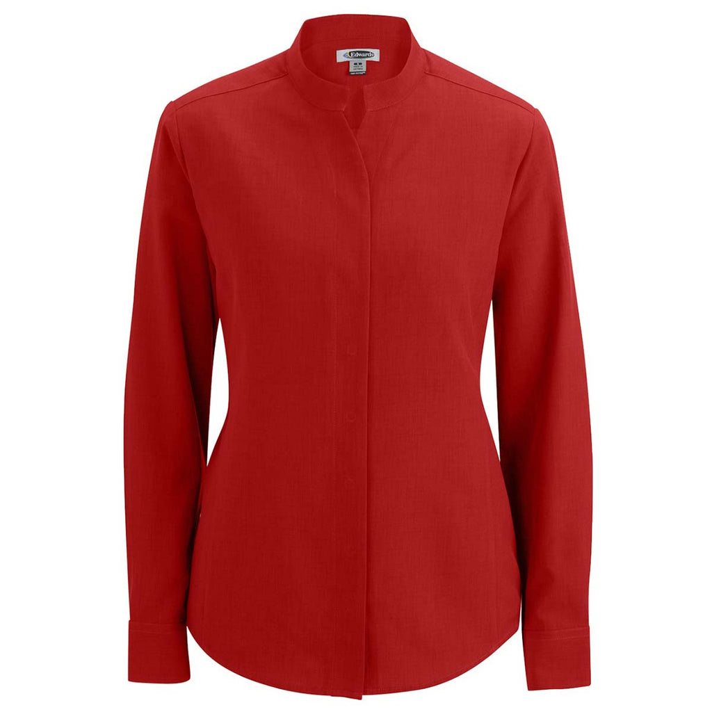 Create a custom, refined look with the Edwards Women's Red Stand-Up Collar Shirt in a wide range of colors. Made of 100% polyester this modern fitting shirt would make excellent hospitality apparel with the clean lines, open neckline and stand-up collar. Also ideal as employee apparel for those working as wait staff or in the kitchen as the shirts are Tuff-Tested with moisture wicking and soil release fabric. These rental ready shirts can display your company logo or embroidered corporate brand with pride. Easy to launder, these shirts will stand the test of time and repeated use.Highlights