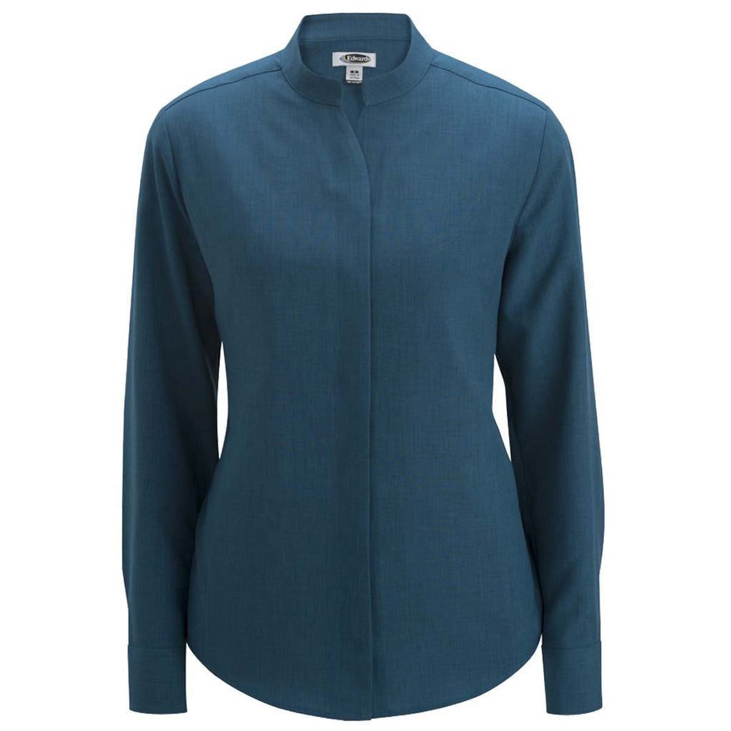 Create a custom, refined look with the Edwards Women's Caribbean Blue Stand-Up Collar Shirt in a wide range of colors. Made of 100% polyester this modern fitting shirt would make excellent hospitality apparel with the clean lines, open neckline and stand-up collar. Also ideal as employee apparel for those working as wait staff or in the kitchen as the shirts are Tuff-Tested with moisture wicking and soil release fabric. These rental ready shirts can display your company logo or embroidered corporate brand with pride. Easy to launder, these shirts will stand the test of time and repeated use.Highlights