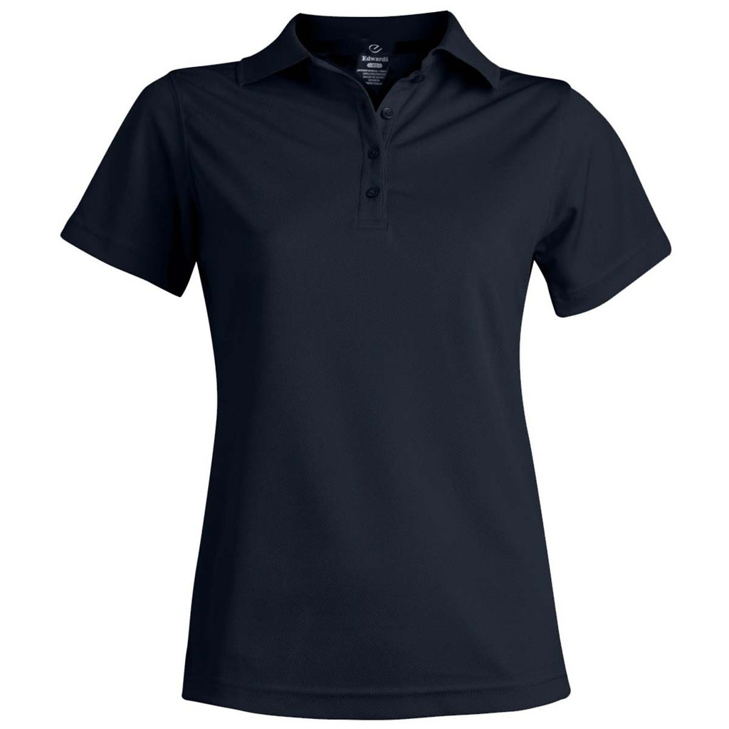 Hit the back nine in this custom Edwards Women's Navy Hi-Performance Mesh Short Sleeve Polo. Made from 100% polyester, this short sleeve mesh weave polo with feminine silhouette wicks moisture from your body when you are working hard. Ideal as employee apparel or even corporate uniforms for those who need them, these polos will carry your corporate embroidery with style and pride. The lightweight fabric offers an antimicrobial shield and soil release so you can always look your best, even when working outdoors. The snag, fade, shrink, and wrinkle resistant fabric can be machine laundered for easy care and to have available for new employees.Highlights