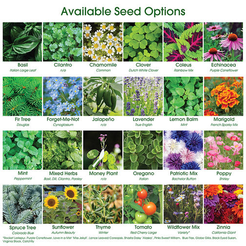 - Seed Options: Basil, Cilantro, Chamomile, Clover, Coleus, Echinacea, Fir Tree, Forget-Me-Not, Jalapeno, Lavender, Lemon Balm, Marigold, Mint, Mixed Herbs, Money Plant, Oregano, Patriotic Mix, Poppy, Spruce Tree, Sunflower, Thyme, Tomato, Wildflower Mix, or Zinnia