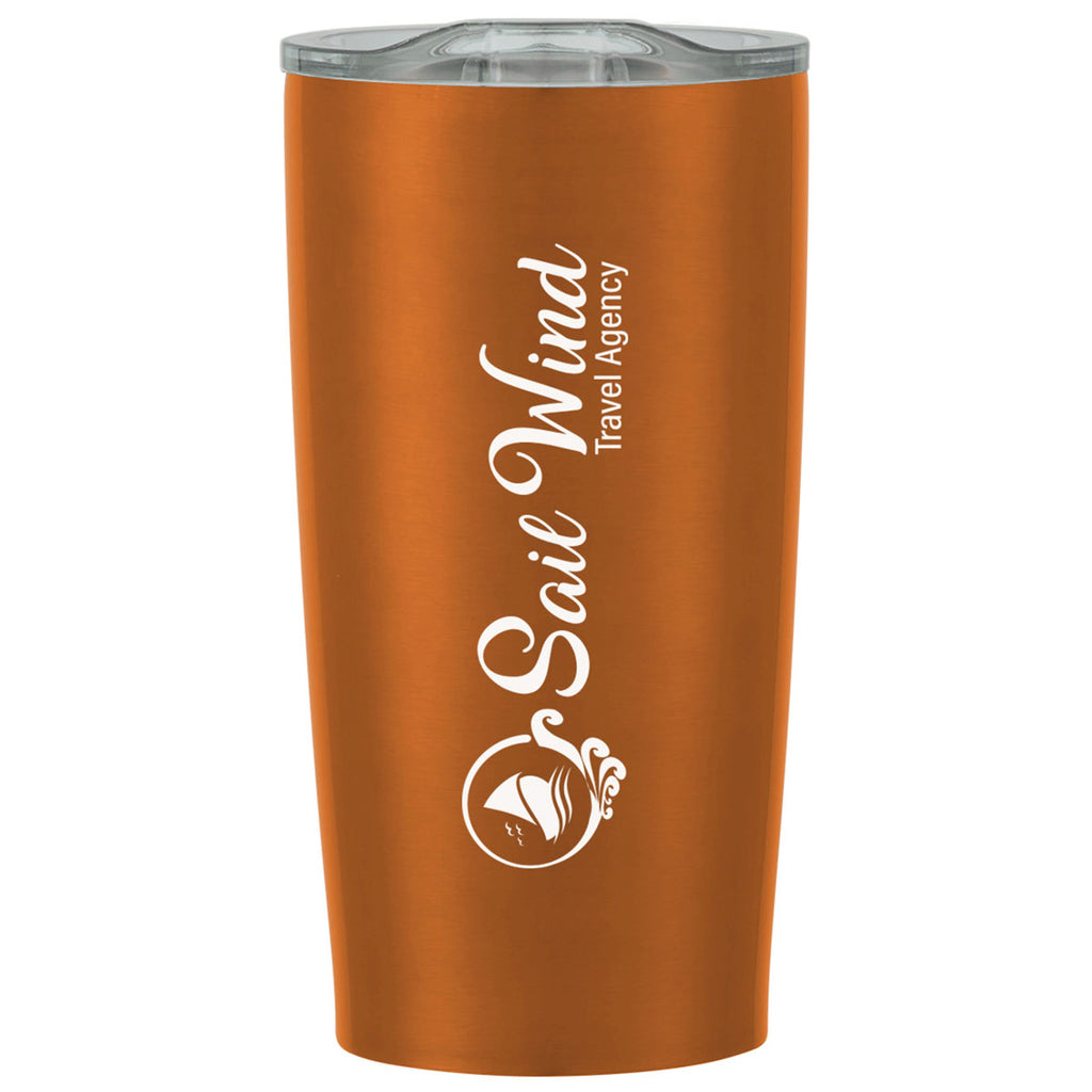 Hit Metallic Orange with Clear Lid 20 Oz. Himalayan Tumbler with a custom logo makes your morning commute and afternoon drink a bit easier to enjoy. The stainless steel tumbler has double wall construction and keeps drinks hot or cool for up to 6 hours as needed. Choose the color you prefer to create a personalized item for your company or event.