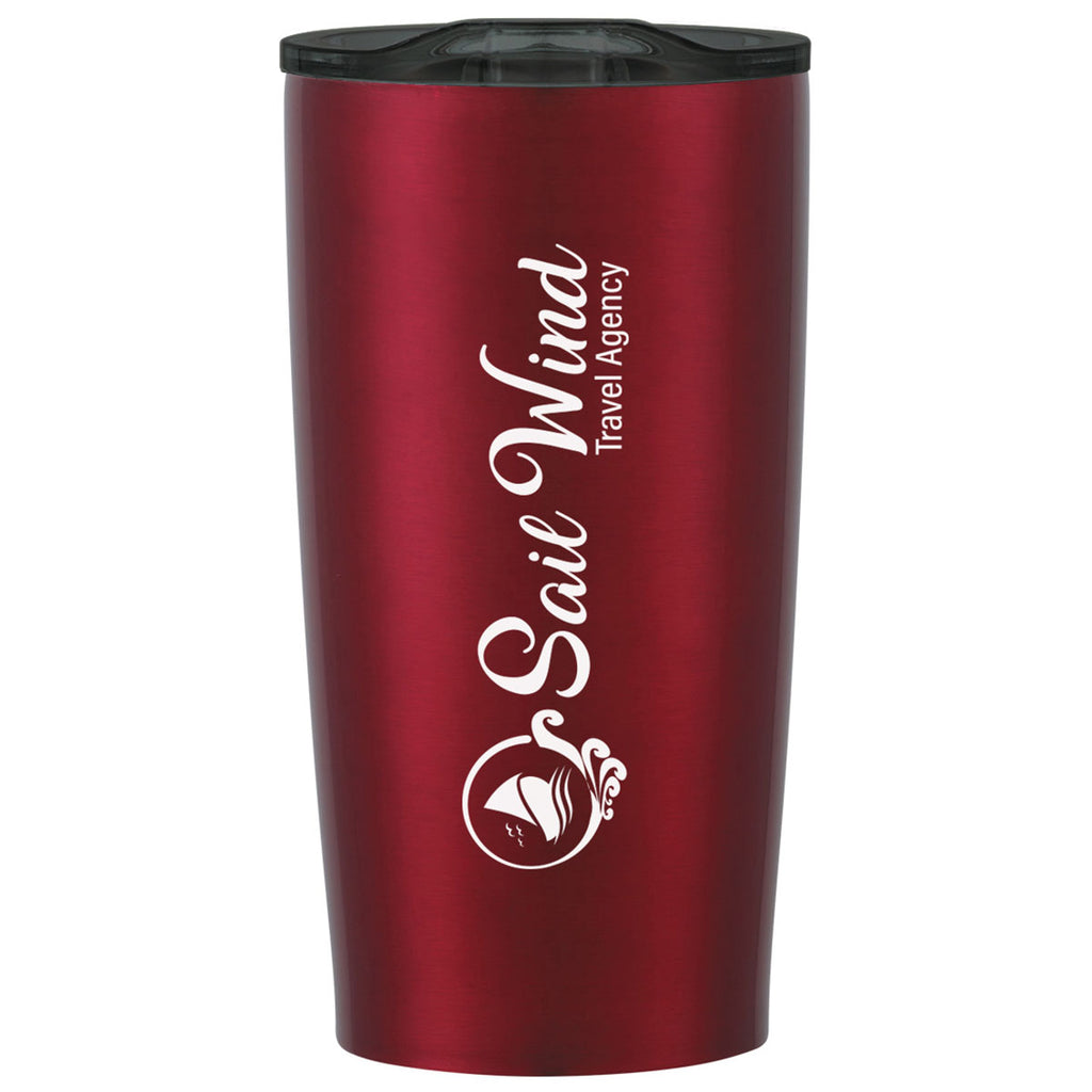 Hit Metallic Red with Charcoal Lid 20 Oz. Himalayan Tumbler with a custom logo makes your morning commute and afternoon drink a bit easier to enjoy. The stainless steel tumbler has double wall construction and keeps drinks hot or cool for up to 6 hours as needed. Choose the color you prefer to create a personalized item for your company or event.