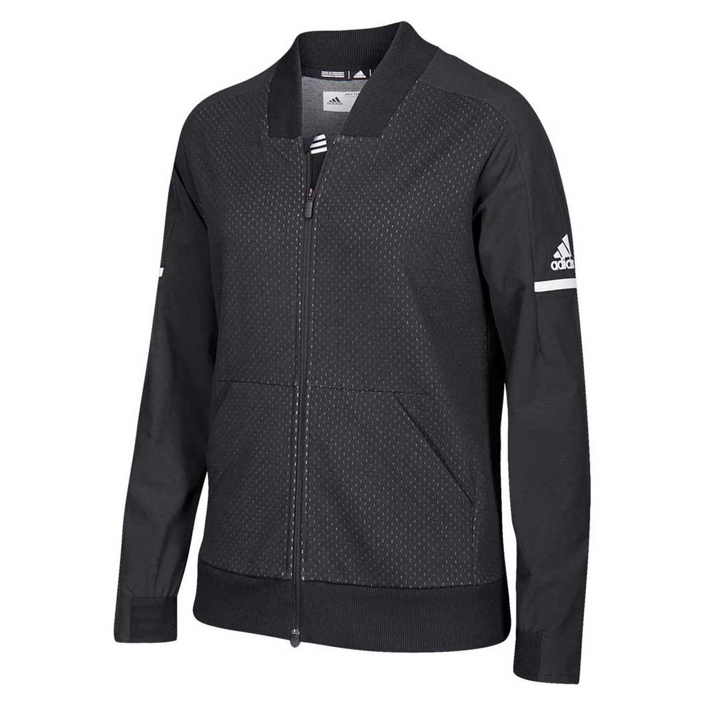 Head outdoors in a custom designed adidas Women's Black/White Squad Bomber with your choice of company or corporate logo. The recycled polyester and cotton mesh blend jacket offers polyester rich elastane sleeves that are water resistant and comfortable to wear. The regular fit means this jacket is easy to layer of a tank or tee and can be used as part of a uniform or as warmup gear for the next team event. The type of jacket everyone imagines when thinking of athleisure wear this bomber makes a great employee gift for any occasion. Place an order soon to add these bombers to your wardrobe.