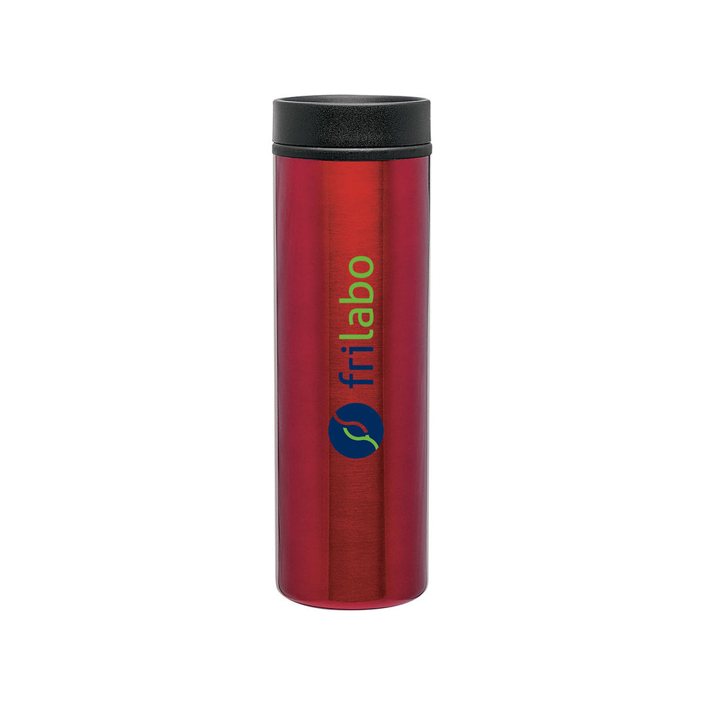 Take your beverage to go in this minimalist, ETS Red Montara Stainless Steel Tumbler 16 oz that features double wall insulation to ensure your beverage stays hot for hours. A push-on swivel minimizes effort for on the go user. Give away this personalized 16 oz tumbler as a gift with company's logo on it.