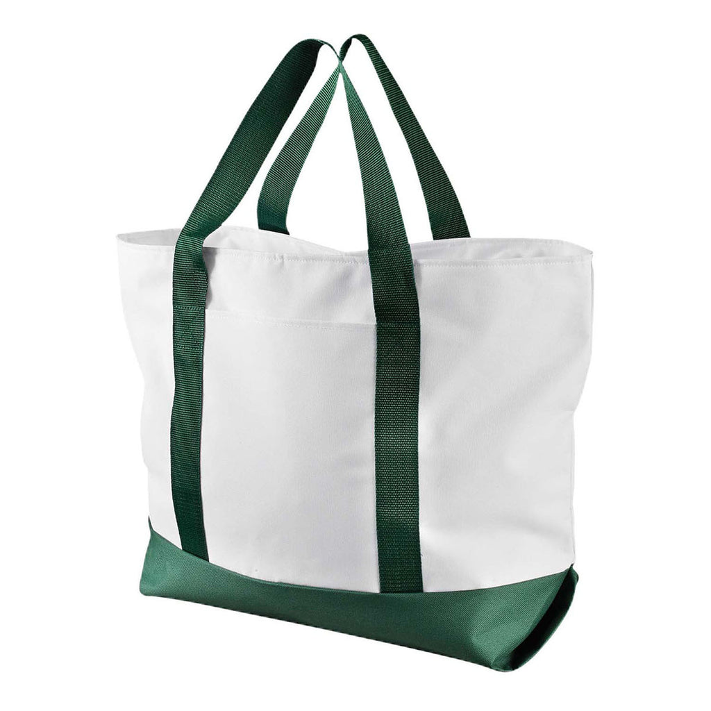 The minimum order for this product is 12 piecesYou arrive to a grocery store and find long lines at every checkout except the self-checkout lanes. Place the highly durable tote bag on the study metal next to the register and start organizing your food and beverages from the ride home. Why deal with flimsy paper bags, when you can rest assured the rugged cotton canvas tote bag never rips or tears. The UltraClub White/Forest Bay View Giant Zippered Boat Tote bag includes a zippered main compartment large enough to secure everything you need for feeding your family. Add a custom logo to the large imprint area to create an effective way to promote your company in the community.