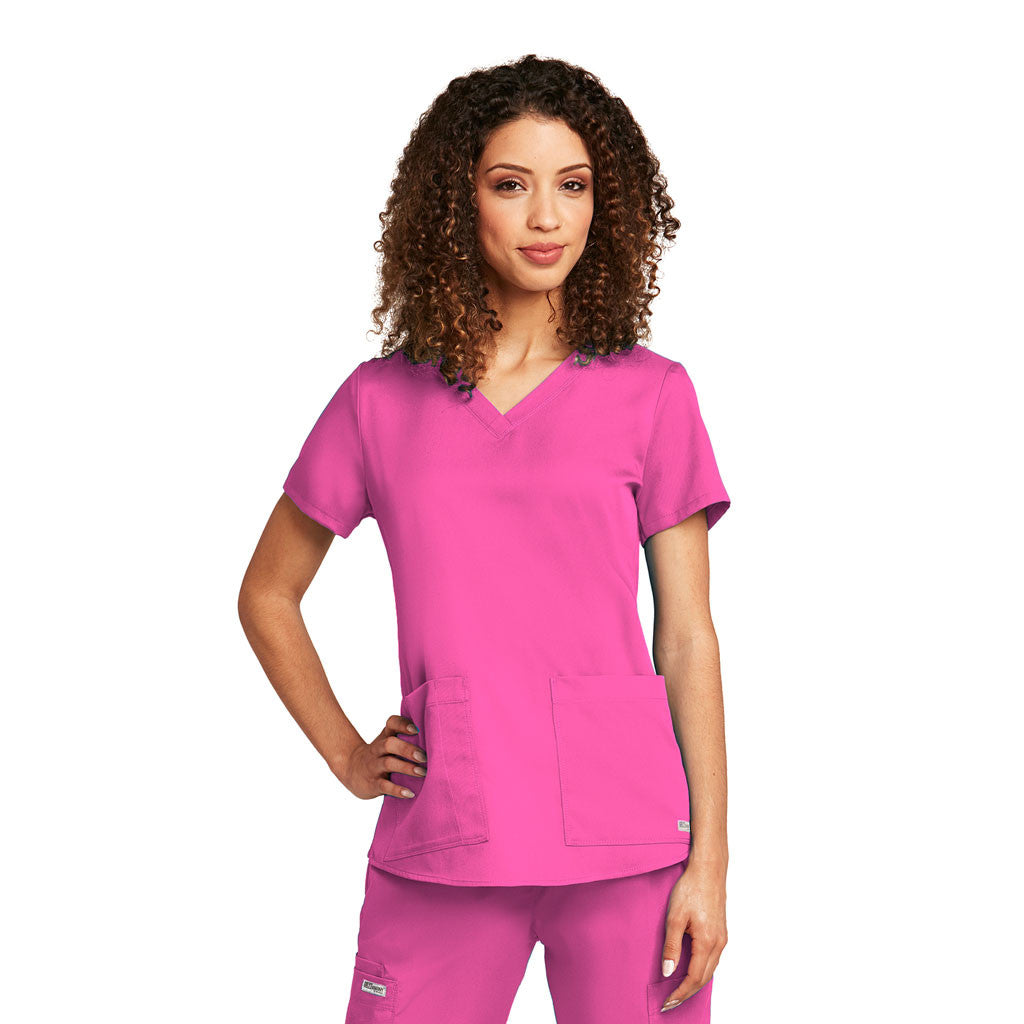 Simply looking at it, you might assume that this Grey's Anatomy Women's Cosmo V-Neck Top has everything you need, but then you look closer. You see the three pockets. You see that the fabric is a more work-ready polyester. You see the comfortable and stylish v-neck design. Then it hits you: this has everything you need and even more. Not only does this top have what you need for a comfortable day at work, but it has what you need to stay comfortable well until the shift is over and you’re ready to relax. Attach your cutom logo to create recognition for your hospital or clinic.Highlights