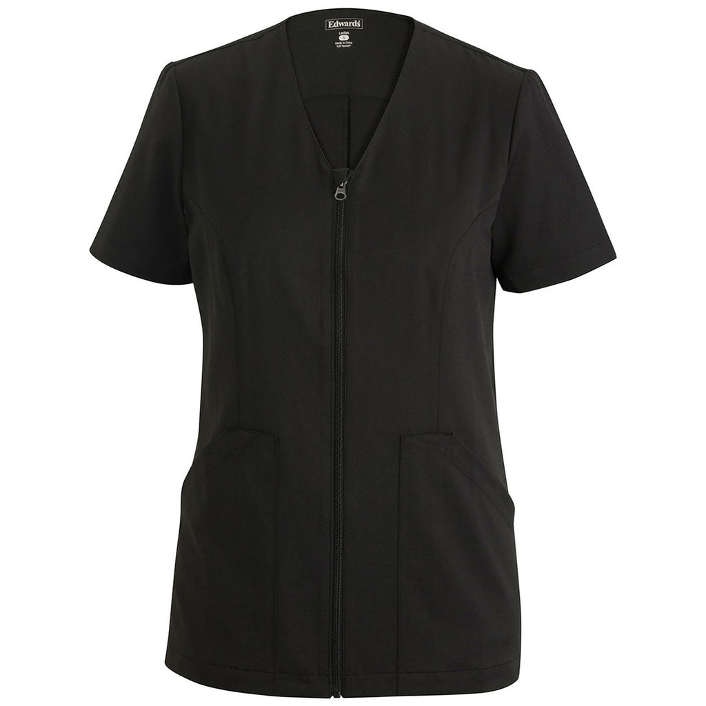 Enjoy a custom look with the Edwards Women's Black Sorrento Power Stretch Service Shirt with embroidery. The lightweight power-stretch polyester allows for natural movement without restriction making it ideal for industries like hairdressing, serving, or cooking as a uniform. The sleek look of the full front zip shirt that can be easily layered is professional while remaining functional. A V-neck with princess seams, angled front pockets, and a traditional fit creates an overall look. Moisture wicking, soil release, and Scotchguard finish also allows for easy wash and wear care.