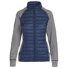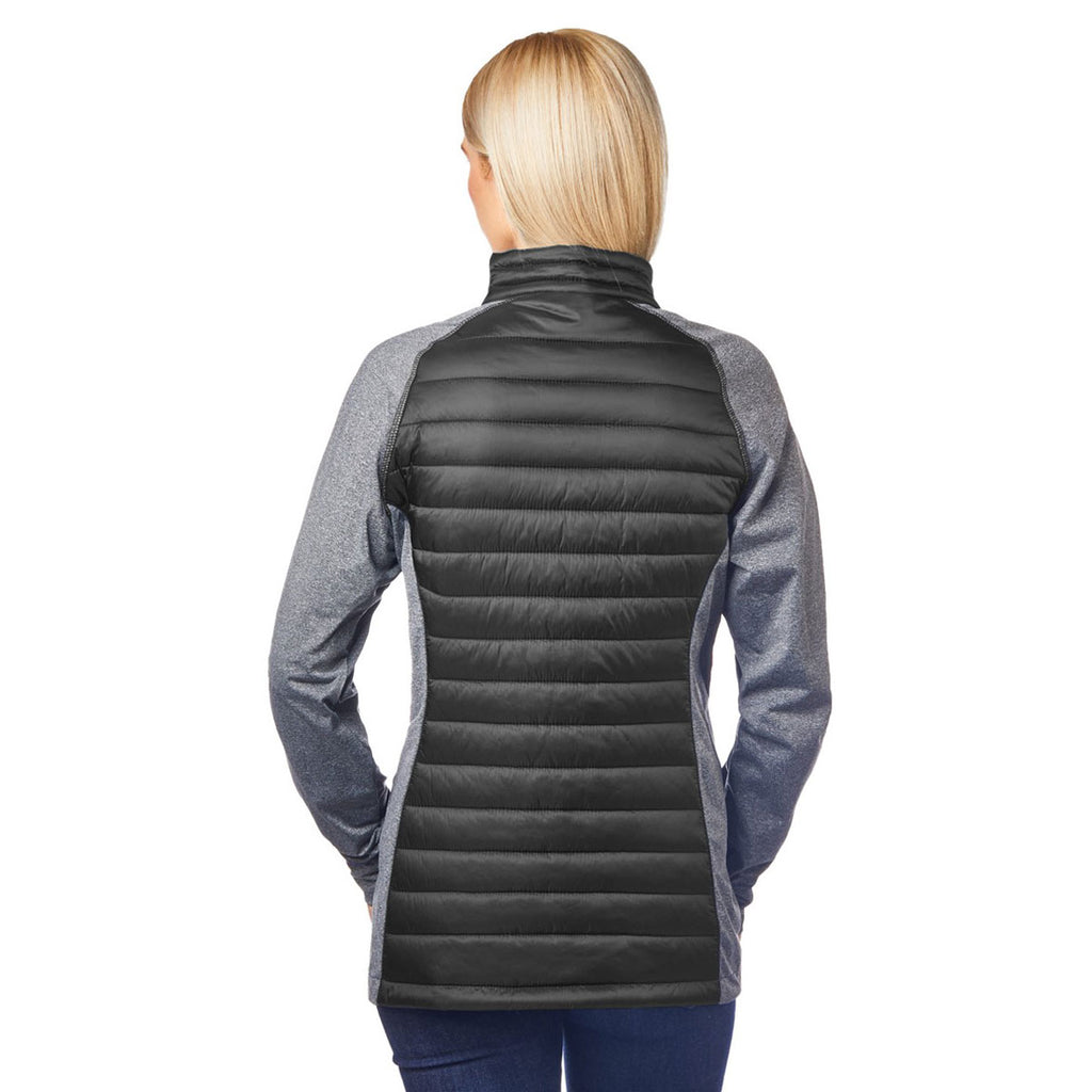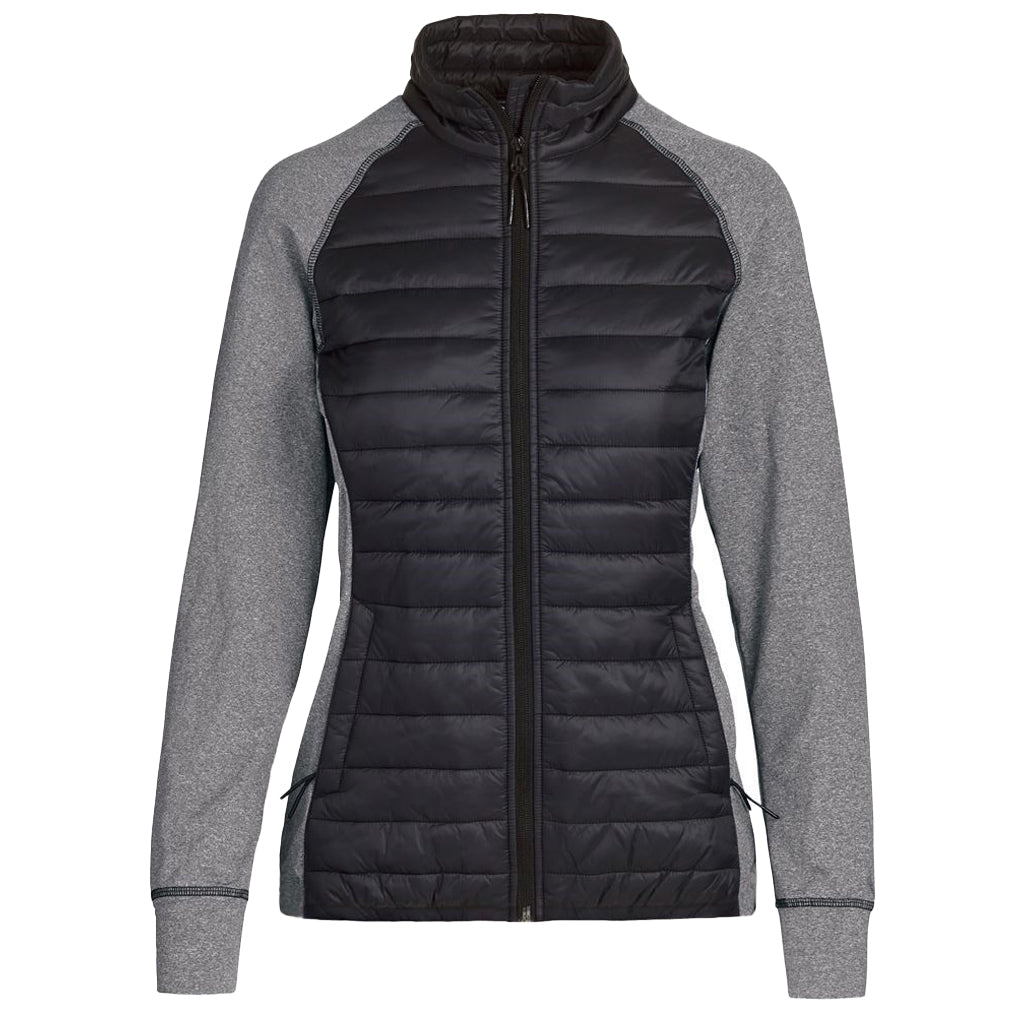 Design a custom logo for the Landway Women's Black/ Grey Refuge Hybrid Lightweight Puffer for a fun embroidered look on a high-end puffer jacket. This stylish jacket keeps you toasty when the weather turns cold. The lightweight shell is water and wind resistant with a contrasting stretchy fabric on the sleeves. Add a company logo to give as employee gifts that offer an athletic fit, storm flap with chin guard, and insulated core for comfort. Consider a custom embroidery to add to your logoed apparel line and watch as these fly off shelves. Place an order today so you do not miss out.Corresponding Men's Style:Landway Men's Black/ Grey Refuge Hybrid Lightweight Puffer