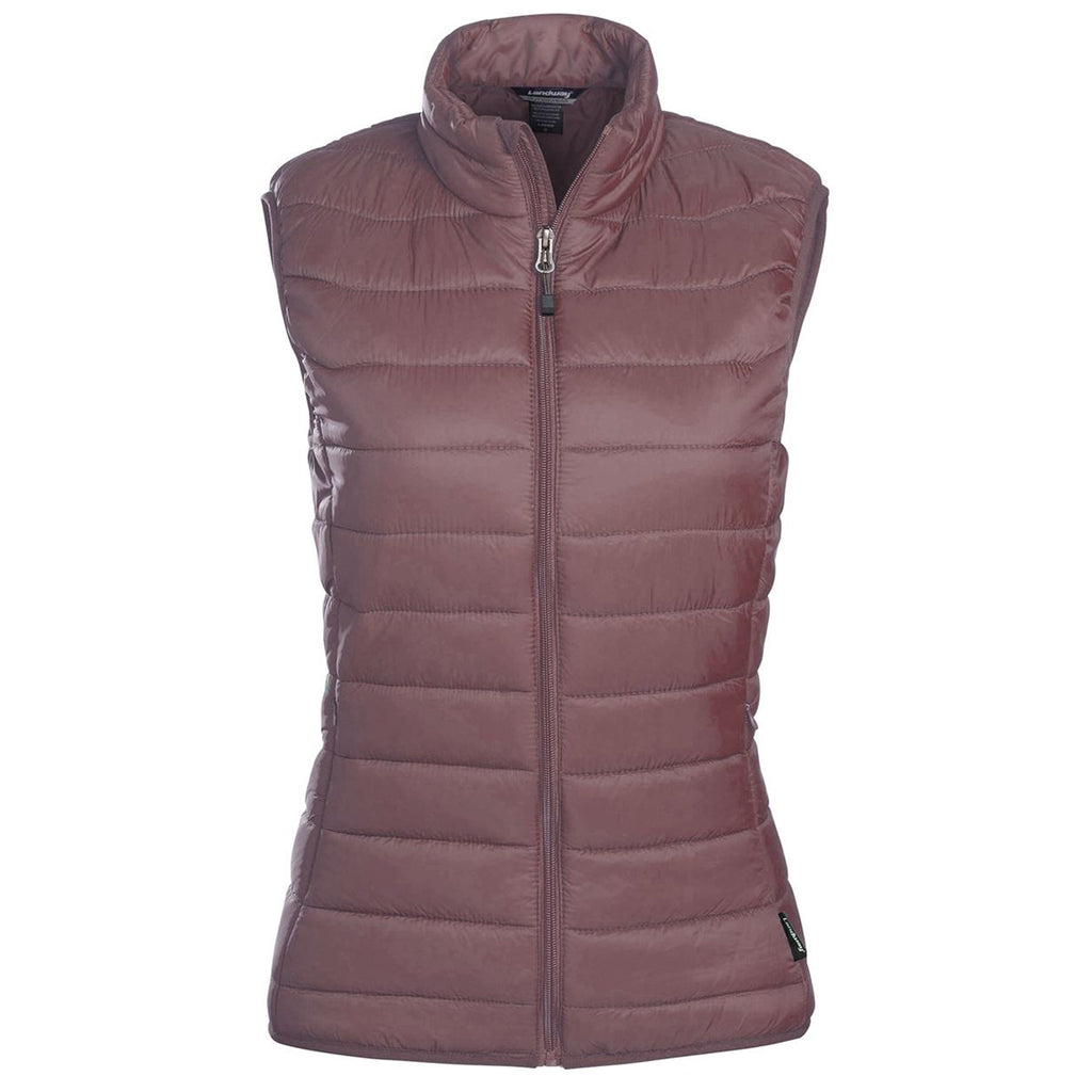 As the ideal corporate gift, the company logoed Landway Women's Rose Taupe Puffer Polyloft Vest comes with a stylish stand-up collar and open waist hem. The new spin on a classic style will grab the attention of professional peers who attend business seminars. With all eyes on the sleek vest, display the corporate logo you attached on the large imprint area. One-hundred percent nylon resists the types of rips and tears that send other styles of vests to the donation pile. Polyester insulation traps body heat to generate additional warmth on the coldest days of the year. Your employees will be more than happy to promote your brand when your custom logo is attached to this vest.Highlights