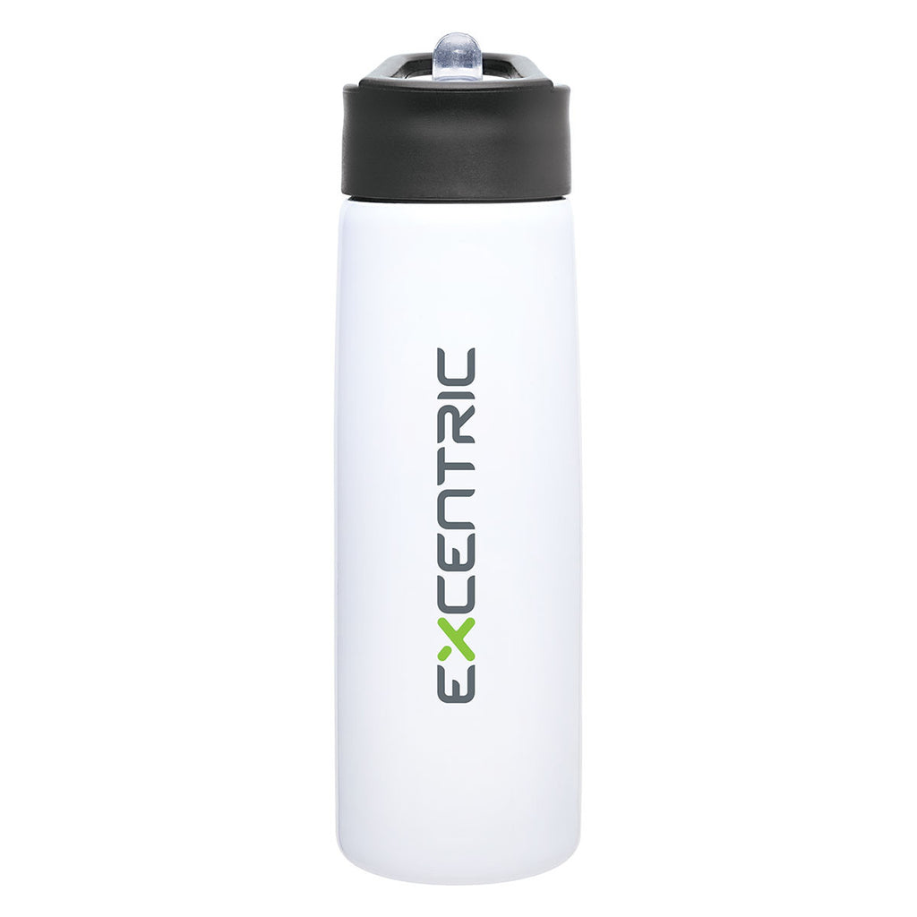 Now here's a stainless steel bottle that makes a bold statement. You might think that's because this H2Go White Hydra Stainless Steel Bottle 48 oz looks bold on the outside, but consider what's going on inside as well. Here we have a single wall construction, threaded lid, flip spout for easy drinking, and even an inner soft straw to keep everything tightly under control when you're on the go. That's a bold statement for anyone who wants to keep a cool refreshment on workouts, hikes, and other adventures. Pep it up even more with your custom logo added to this stainless steel bottle.