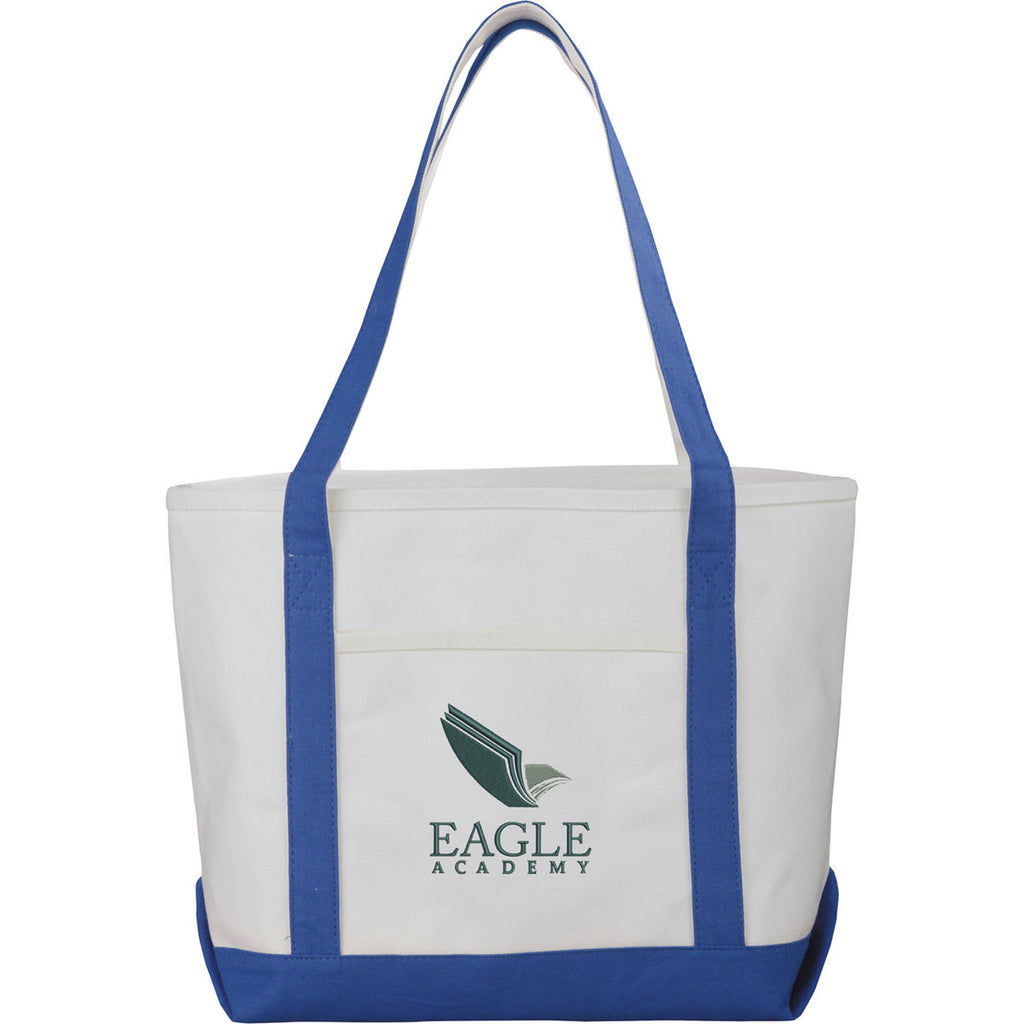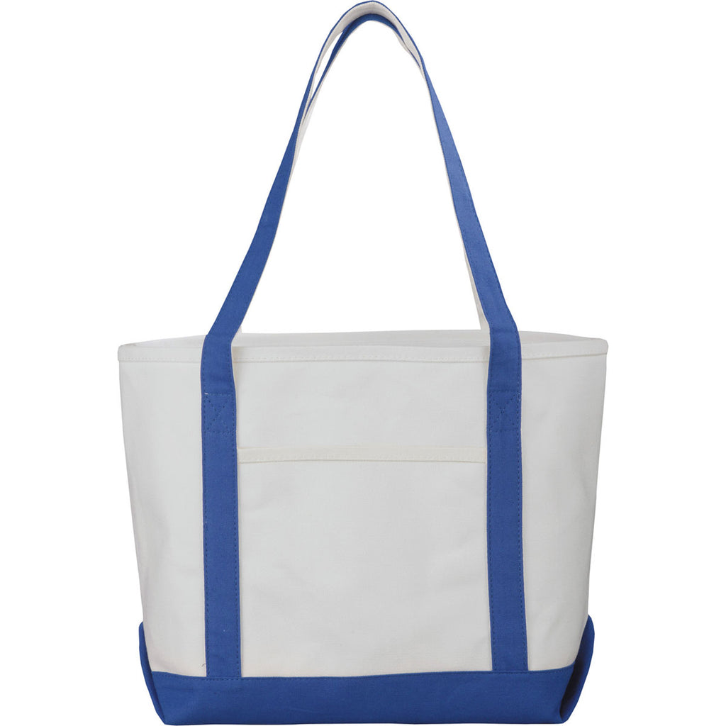 Your custom logo will pop when added to the eye-catching Leed's Royal Cotton Canvas Premium Boat Tote 18 oz. The classic two-tone design of this boat tote is sure to catch people's attention when carried at trade shows, while traveling, or to and from everyday destinations. Recipients will appreciate the large main compartment, generous handle, and heavy weight material for durability.The minimum order for this product is 50 pieces.
