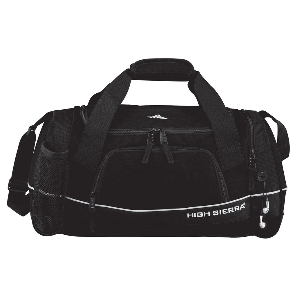 The openings around the High Sierra Black 22" Bubba Duffel Bag provide you with room for all your large and small items alike. The neoprene wrapping and the webbing around the surface will keep moisture from being a hassle while you use it. The design includes room for a corporate logo. Order this duffel bag for your promotional needs by adding your custom logo. If you're running a gym or fitness center and you need something that your clients will enjoy using, this duffel is the perfect choice.Highlights