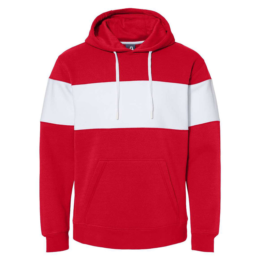 Stand out with embroidery on the J. America Men's Red Varsity Fleece Colorblocked Hooded Sweatshirt. Choose a custom logo to create team or warm-up gear that will get noticed with a solid bottom, top and shoulders and large colorblocked stripe across the chest. A drawstring hood with contrasting drawstring protects from the wind when needed on this easy to layer hooded sweatshirt that nearly anyone can enjoy. Ideal as an employee gift with a company logo or a custom gift for friends, this sweatshirt makes those long days at home, outdoors, or running errand much more comfortable.Corresponding Women's Style:J. America Women's Red Varsity Fleece Piped Hooded Sweatshirt