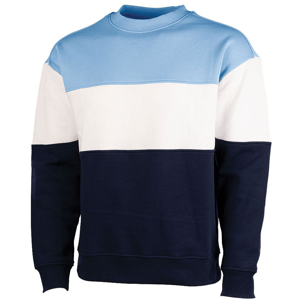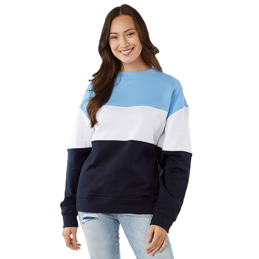 A company logo will look great on the Charles River Unisex Light Blue/White/Navy Westerly Crew as part of employee apparel or even employee gifts. The cotton polyester fleece blend has contemporary colorblocking in a unisex style, though women should order down a size for a true to fit styling. The crew neckline on the long sleeve shirt means layering is easy when you arrive at work and when leaving. Use embroidery to enhance this crew that can be worn at home, at work, and everywhere in between.Highlights