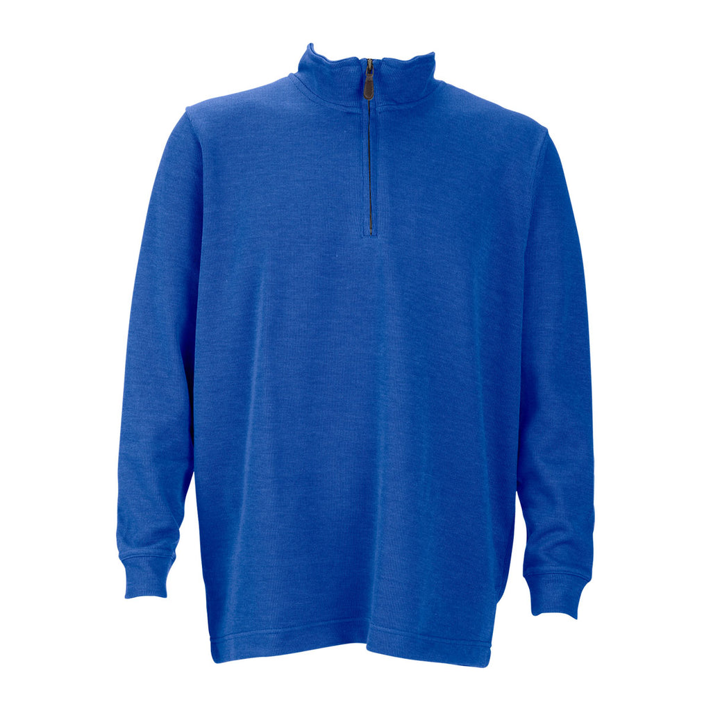 Order the embroidered Vantage Men's Royal 1/4-Zip Flat-Back Rib Pullover to thank the loyal customers who have been the backbone of your company for years. Add a custom logo on the large imprint area to spread the word about your company in the community. Self-good cuffs and the stand up collar add elegant style elements for a rugged pullover meant to wear during outdoor adventures. Silky cotton combines with tear resistant polyester to create a fabric that withstands the worst pounding. Thick layering of the cotton traps body heat to offer additional protection against cold temperatures. Part sweater, part sweatshirt, the all-purpose pullover takes care of your fashion needs.Corresponding Women's Style: Vantage Women's Royal 1/4-Zip Flat Back Rib Pullover