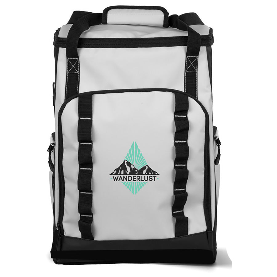 Origaudio White/Black Chillamanjaro 24 Can Venture Cooler Backpack with a corporate logo is the outdoorsman's dream with a 24-can capacity and separator to keep items dry as needed. Convenient carrying handles can be used, or the cooler can be worn as a backpack while hiking or heading to the campsite. Perfect for camping and survivalist stores. Order today.The minimum order for this product is 1 piece.