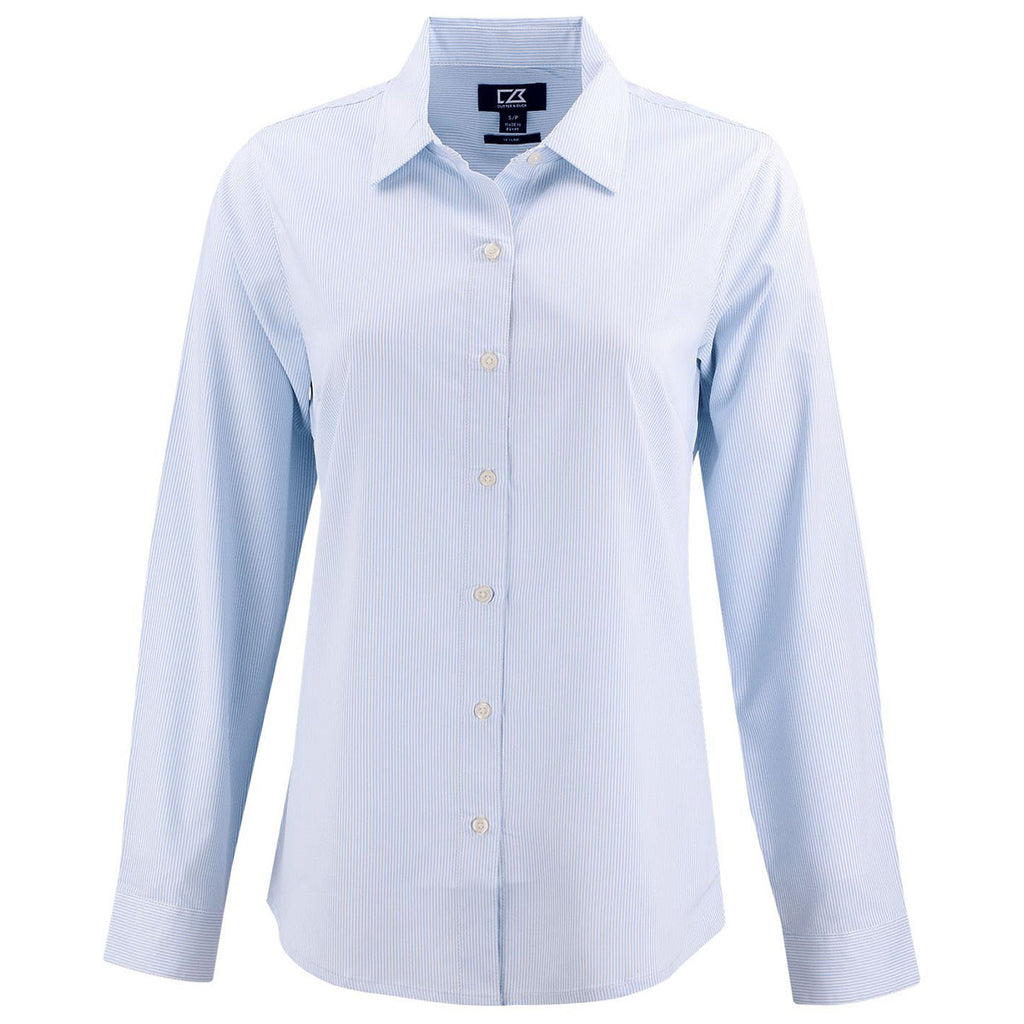 The Cutter & Buck Women's Pale Blue/White Skyline Epic Confidence Recycled Pinstripe Long Sleeve Dress Shirt brings sharp, custom branding to eco-conscious business wear. Designed for comfort and style, its recycled stretch fabric delivers easy movement with tailored lines. Perfect for corporate gifting, uniforms, or resale with elevated sustainability.Corresponding Men's Style: Cutter & Buck Men's Pale Blue/White Skyline Epic Confidence Recycled Pinstripe Long Sleeve Dress Shirt