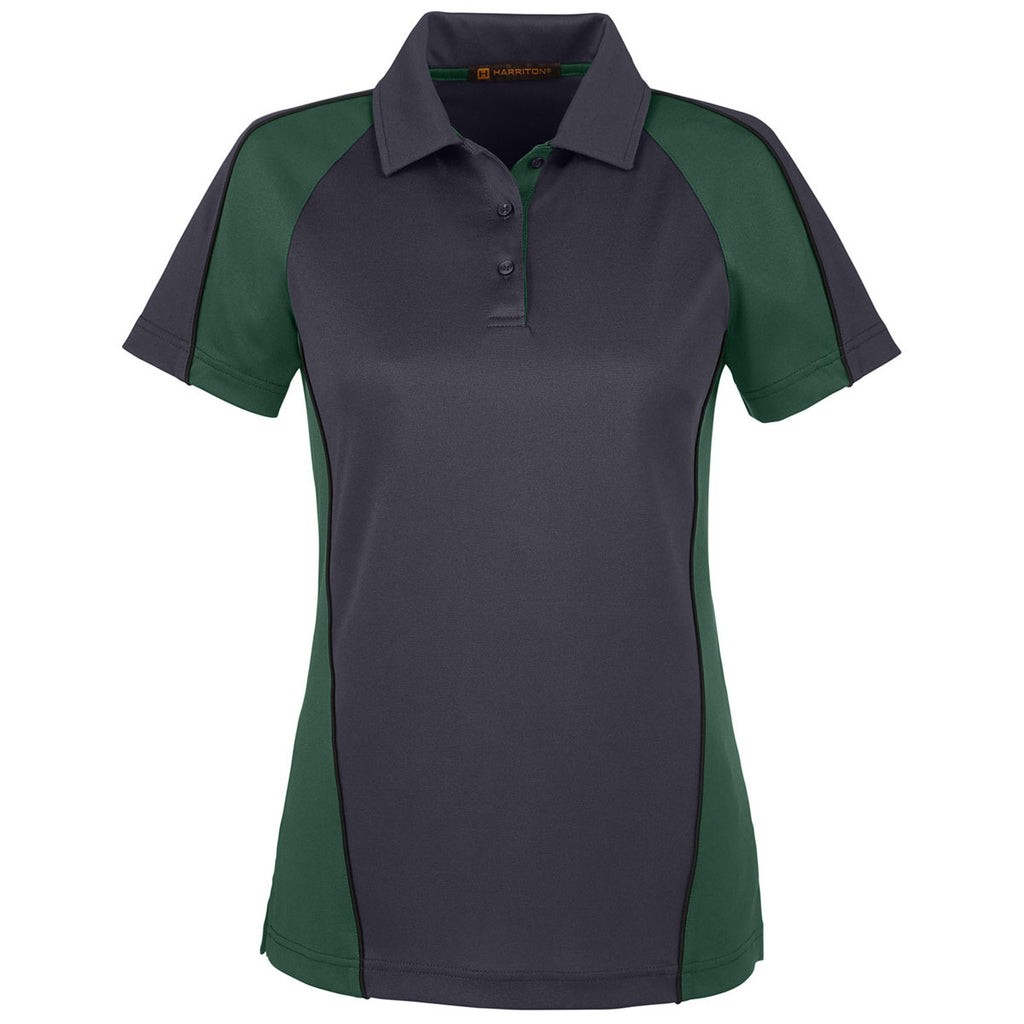 Choose a company logo for the Harriton Women's Dark Charcoal/Dark Green/Black Advantage Snag Protection Plus Colorblock Polo for employee apparel that is unparalleled. These polyester jersey polos have color pops in all the right places to create a feminine silhouette that all can appreciate. The short sleeve polo is made to face whatever the day has in store with moisture wicking and antimicrobial properties with UV 15-29 protection depending on color choice. Add embroidery to create a custom gift that will enhance any wardrobe and can be appreciated by all.Corresponding Men's Style:Harriton Men's Dark Charcoal/Dark Green/Black Advantage Snag Protection Plus Colorblock Polo