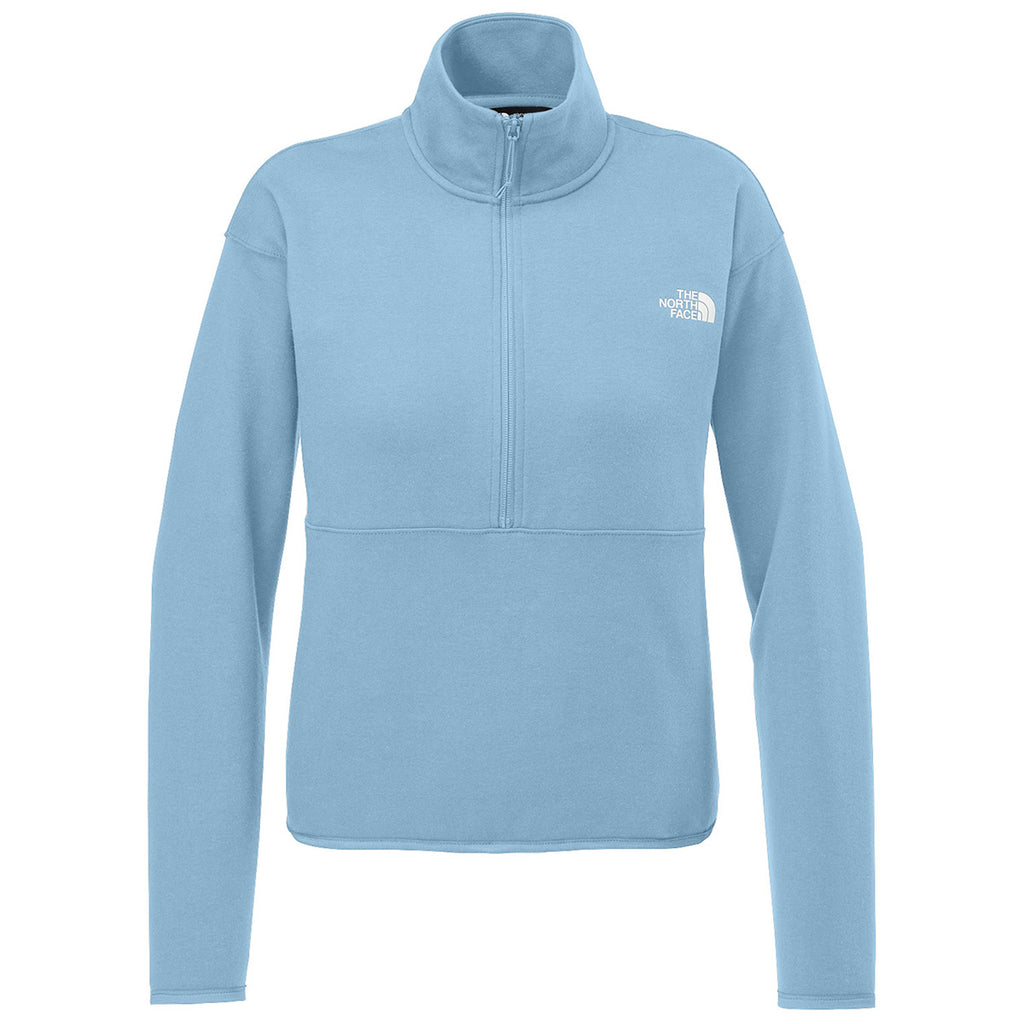 The North Face Women's Steel Blue Double-Knit 1/2-Zip Fleece with a corporate logo makes a wonderful employee gift or part of a uniform. The easy-to-wear fleece is warm without being bulky and perfect for trade shows and special events. Drop shoulders and a stand collar add to the put-together look of this fleece.