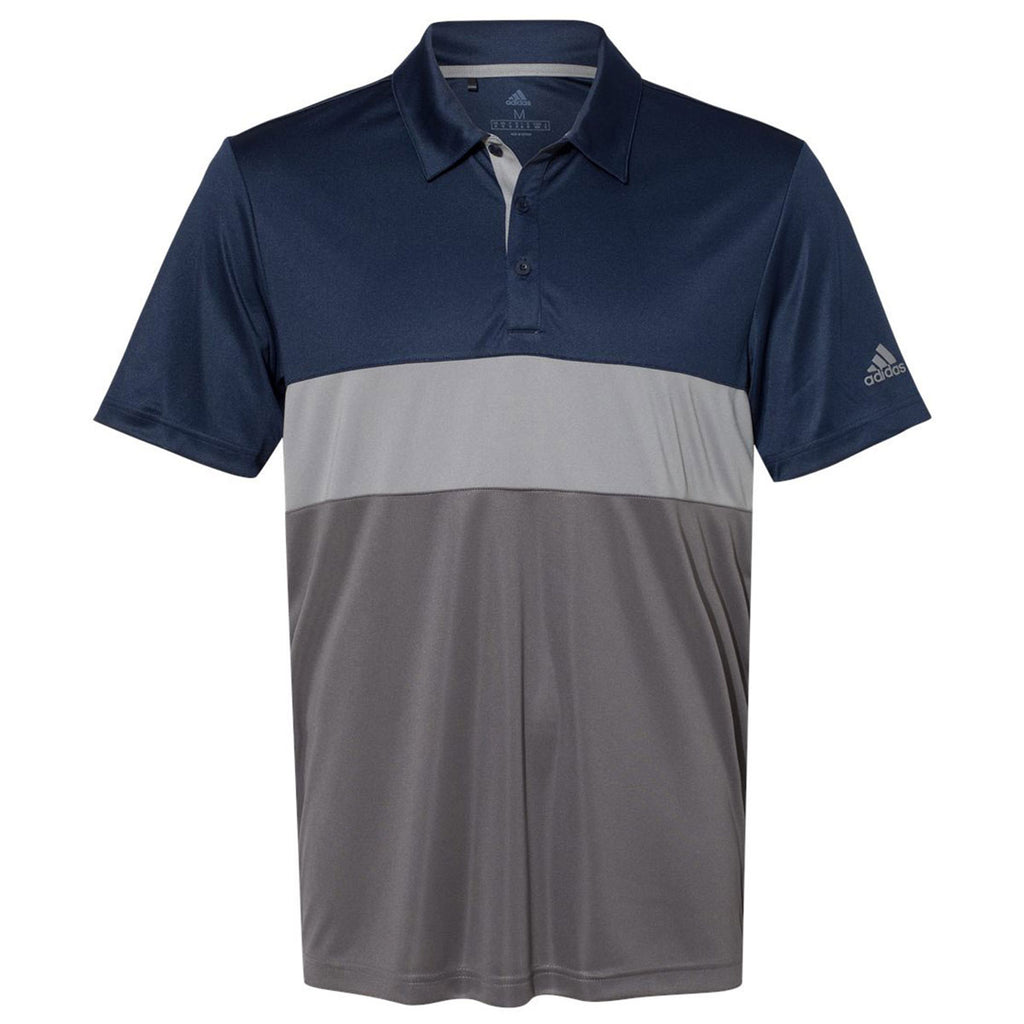 Take polos to the next level with a custom Adidas Men's Collegiate Navy/Grey Three/Grey Five Merch Block Sport Polo. The tri-color block design on this polo make it stand out from traditional coloring to really grab the attention of others. Add a custom embroidery to create interesting gold wear with the 100% recycled polyester jersey with a hydrophilic finish. Made as a traditional polo with a three button placket and open hem sleeves this polo is a must have as employee apparel or even corporate apparel for those who like a bit of color. Add a company logo and offer these as gifts or just ad to your personal collection for days spent on the golf course.