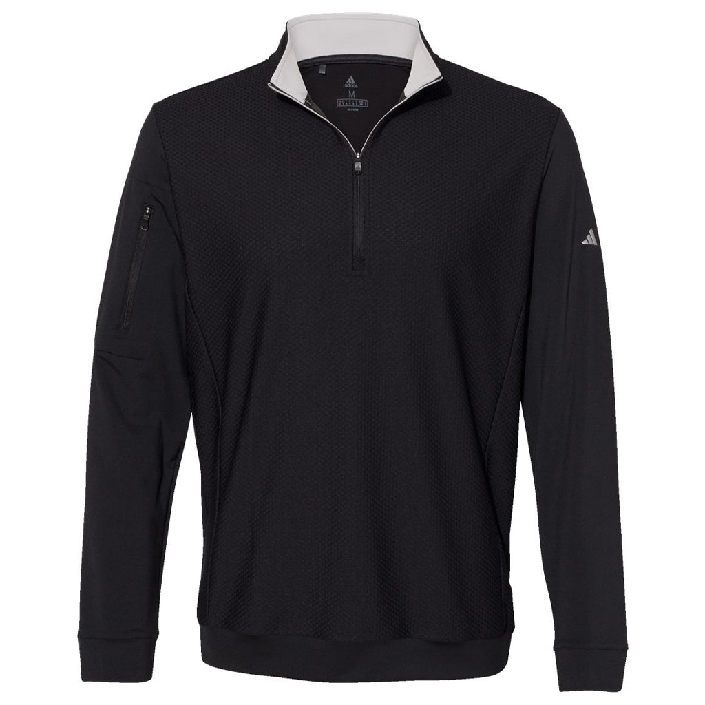 Sleek, stylish, and fashion forward describe the custom embroidery Adidas Men's Black Performance Texture Quarter Zip. Made of a medium weight polyester, elastane interlock blend with hydrophilic finish this quarter zip is ideal as warm-up athleisure apparel or just to wear as you run errands. The textured front body with solid jersey sleeves allows for all day comfort. A right arm zipper pocket is great for small items. Add a custom logo to use as an employee gift or simply add to the wardrobe of friends and family. The UPF 50+ protection makes this perfect for enjoying the great outdoors.
