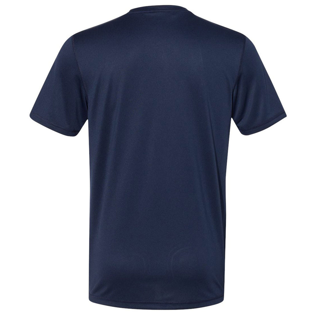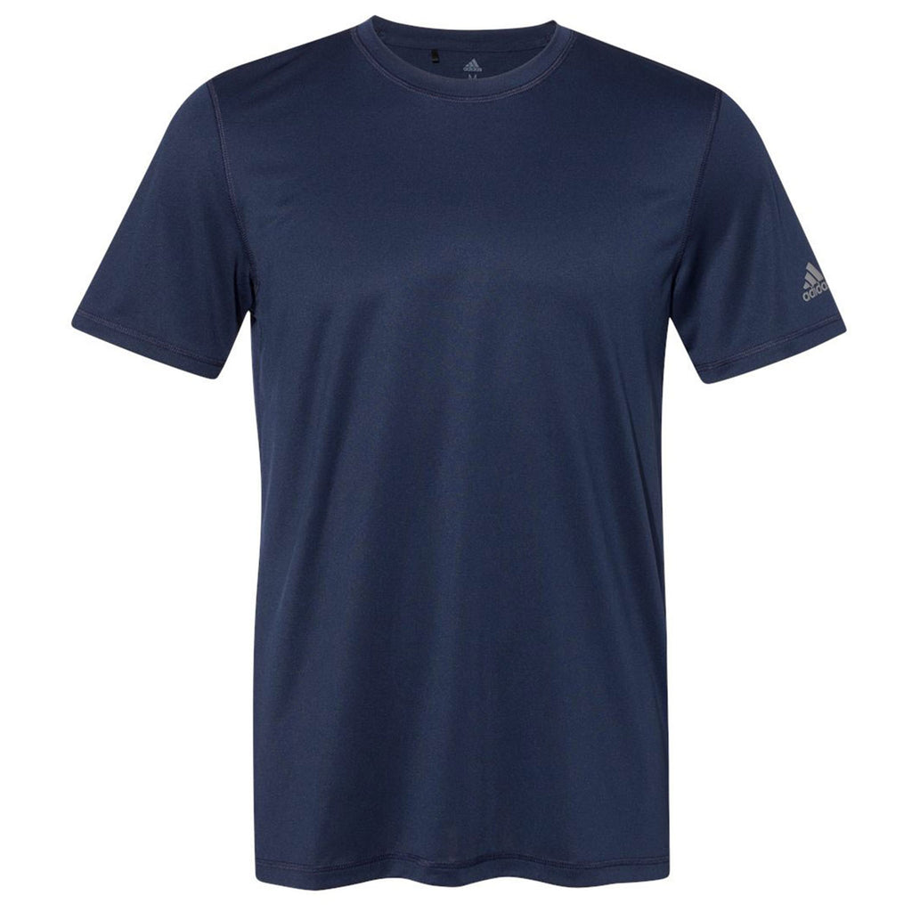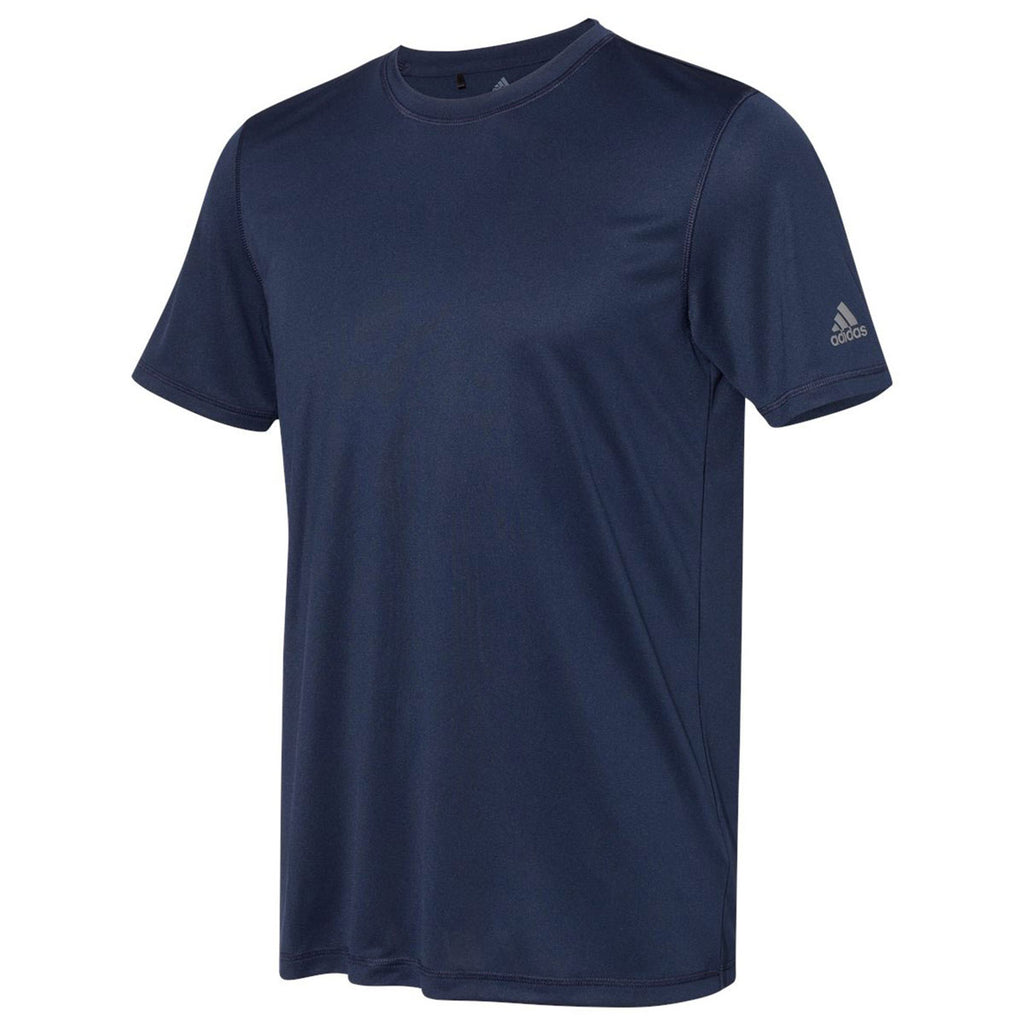 Stay comfortable and look great in a screen print Adidas Men's Collegiate Navy Sport T-Shirt. Ideal for the gym, a day with the family, or a quick round of golf, this 100% recycled polyester pique tee is good for the environment and great for you with UPF 50+ protection. Add a company logo to use these as employee apparel that will stand up to hard work or a corporate logo to use for corporate events as a way to showcase your company or organization. The crewneck design with open hem sleeve is designed for all day comfort whether worn alone or layered for warmth.