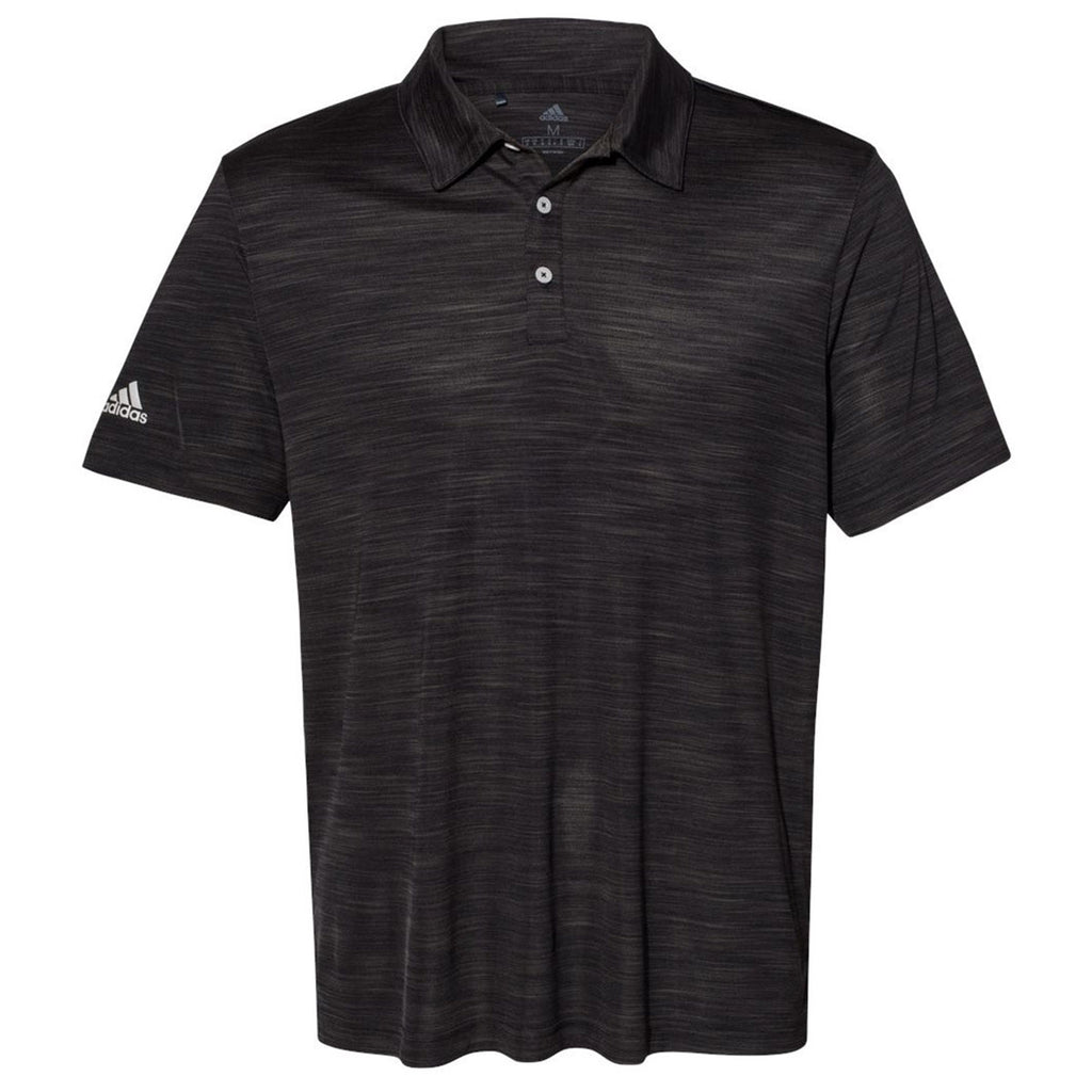Play the back nine in an embroidery Adidas Men's Black Melange Sport Polo. Made of environmentally friendly 100% recycled polyester with striated heather interlock in a lightweight feel, this sport shirt will stand up to hard work, play, or fun. Add a company logo to use these as employee apparel or gifts that will be put to use immediately. The self-fabric collar, three button placket, and open hem sleeves and bottom hem offer a perfect business friendly look when paired with a jacket. Use as corporate apparel with a custom logo to stand out and get noticed or simply enhance your personal wardrobe.