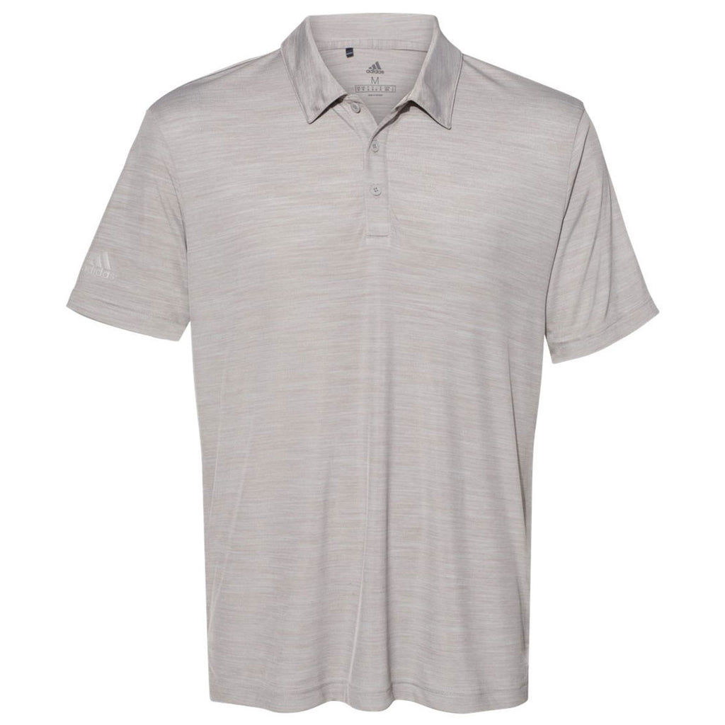 Play the back nine in an embroidery Adidas Men's Mid Grey Melange Sport Polo. Made of environmentally friendly 100% recycled polyester with striated heather interlock in a lightweight feel, this sport shirt will stand up to hard work, play, or fun. Add a company logo to use these as employee apparel or gifts that will be put to use immediately. The self-fabric collar, three button placket, and open hem sleeves and bottom hem offer a perfect business friendly look when paired with a jacket. Use as corporate apparel with a custom logo to stand out and get noticed or simply enhance your personal wardrobe.