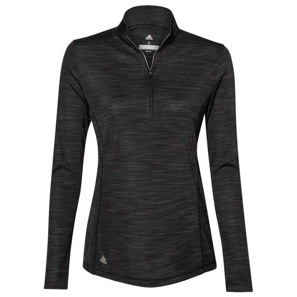 Create a fashion forward custom look with the Adidas Women's Black Melange Lightweight Quarter Zip. This sleek lightweight quarter zip is made of 100% recycled polyester interlock knit for an easy to wear design that will be a big hit with most wearers. Whether adding a custom logo and using as part of athleisure apparel for a team event or an employee gift, this pullover is a must have. The moisture wicking material with a UPF 50+ rating is perfect for enjoying the outdoors while hiking, biking, or hanging out with friends around the bonfire. Place an order today to make sure these are on hand to meet whatever needs arise.