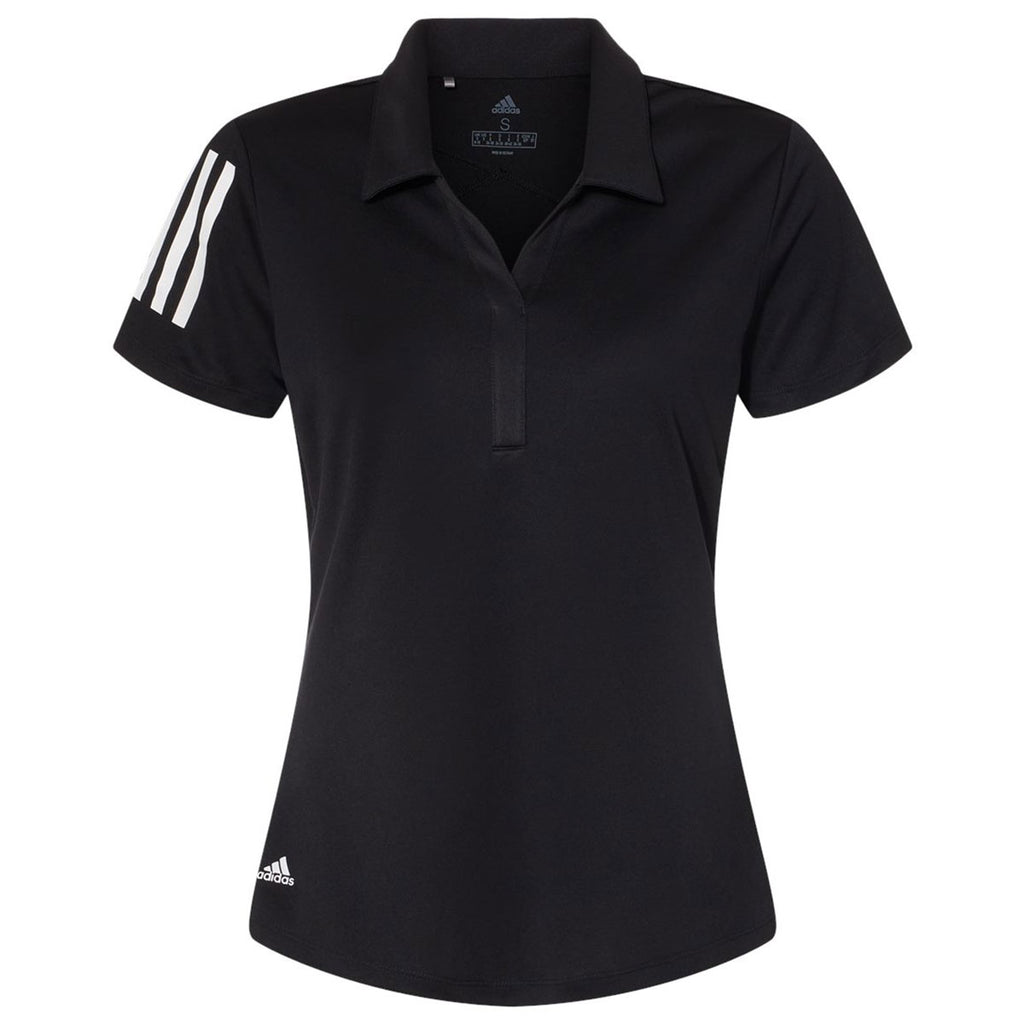 Add your custom embroidery to the adidas Women's Black/White Floating 3-Stripes Sport Shirt to create a stylish look that can easily serve as part of a uniform or an every day wardrobe addition. The feminine fit with unique asymmetric stitching across the back placket add flair to this already ideal look. Made of recycled polyester, this sport shirt offers a hydrophilic finish and UPF 50+ protection making it perfect for days spent indoors or out working or playing hard. Add a company logo to offer as employee gifts that people will appreciate.