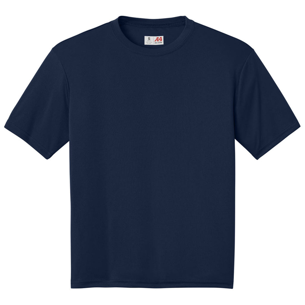 Keep cool with the A4 Men's Navy Cooling Performance Short Sleeve Tee. Built with moisture-wicking fabric, this tee is designed for workouts, sports, or active jobs. Customize it with your logo to create branded apparel that's functional and comfortable. Its lightweight design makes it a reliable choice for corporate promotions or team uniforms.