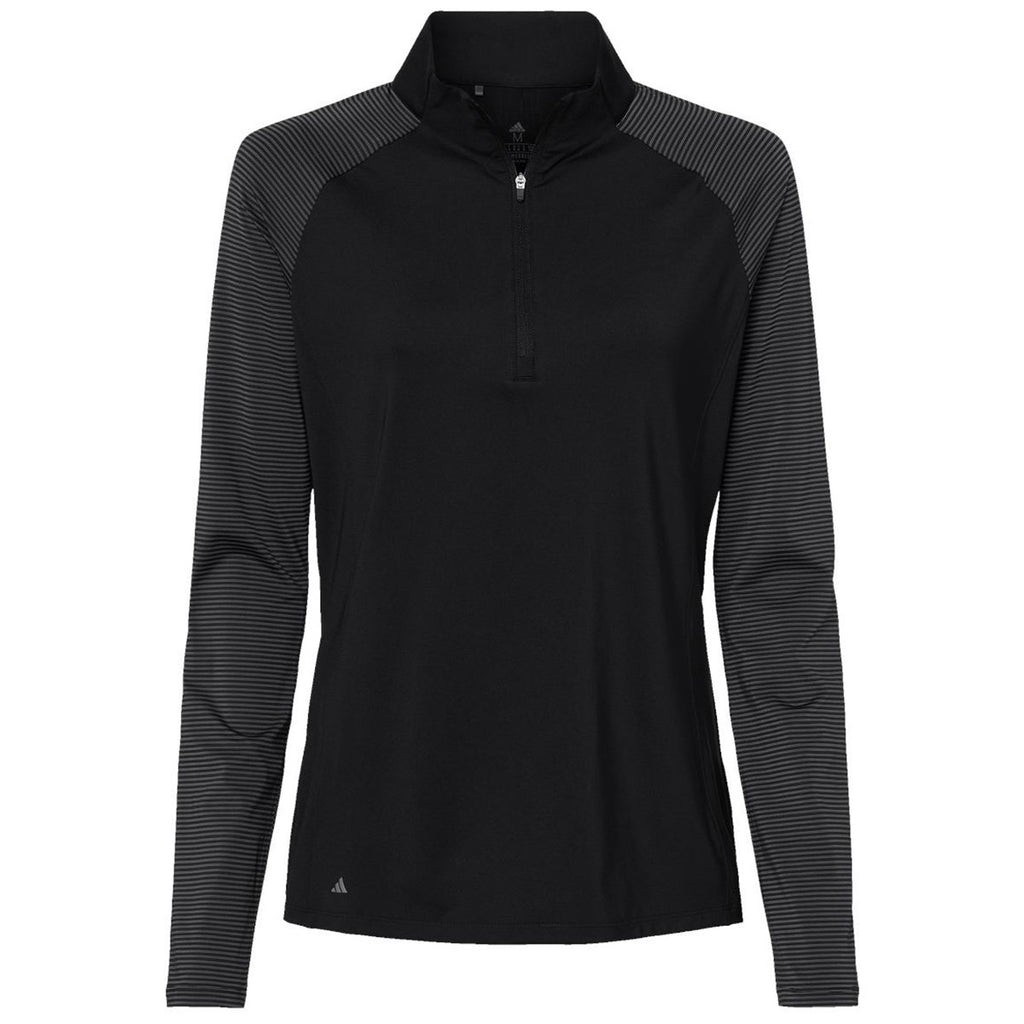 Adidas Women's Black Stripe Block Quarter-Zip Pullover with a corporate logo is a fun way to showcase your company or brand while promoting a healthy lifestyle. This sleek pullover offers moisture-management properties, UPF 50+ protection, and a self-mock collar so you can enjoy a morning jog, play a game of tennis, or hit the gym in style.This product cannot ship outside of the United States